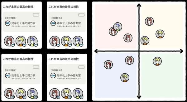 互いにコミュニケーションの習性や意思決定の軸をもとに「相性」がわかるため、チームビルディングや相互理解に活用いただけます。