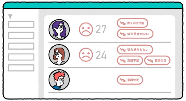 サポート対象者を未来予測に特化したAIを用いて発見し、サポートの「優先度」を可視化。個人のスコアからエンゲージメント向上の妨げになっている事象の「トレンド」を解析するため、より効果的な個人フォローが可能です。