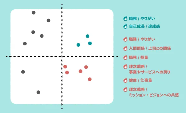 チーム単位での分析にとどまらず、個人の結果を深掘り、分析が可能。エンゲージメントの結果に加え、個々人が大事にする価値観や特性を分析できます。