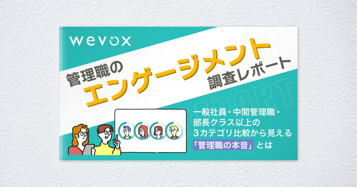 「Wevox(ウィボックス)」は、組織の状態を可視化するツールとして、エンゲージメントサーベイを提供しています。 利用企業様のサーベイ結果を分析したところ、エンゲージメント向上には、管理職やメンバーの積極的な参加が重要な要素であることが明らかになりました。 一方で、風土改革や業績向上など、さまざまなシーンで管理職の役割がますます重要になり、負担も年々増加しています。 そこでWevoxでは、エンゲージメントサーベイのデータをもとに、管理職の皆様が抱える悩みや現状を詳しく分析しました。 ぜひ、管理職の皆様の支援に本レポートをお役立てください。