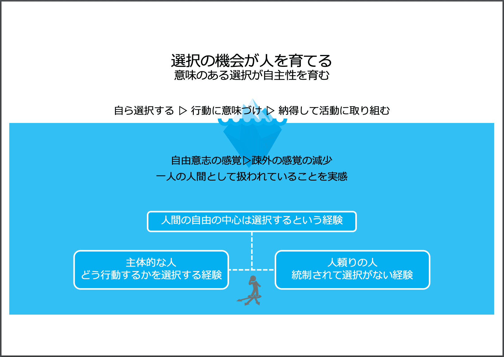 意味のある選択が、人の自主性を育みます。自ら選択することで、行動に意味づけがされます。自分自身で納得して活動できるんですね。そういった活動をしているうちに、自由意志の感覚が取り戻されるんです。なので、自らと向き合い、自己理解を進めることが1on1を行ううえでの大前提になります。