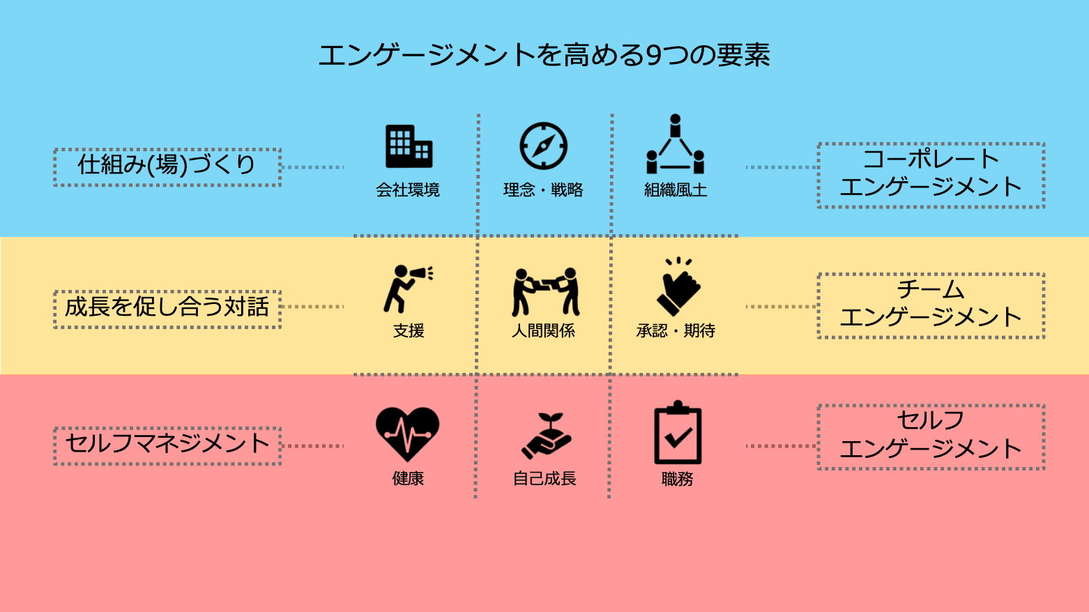 ただ最初のコーポレートエンゲージメントは、自分だけの力で変えるのは少し難しいです。自分の思い通りに会社全体を動かしてオフィスを変えることなどは、工数が大きくかかり、現実的ではありません。一方で下の2つ、チームエンゲージメント、セルフエンゲージメントは自らの工夫によって高められます。