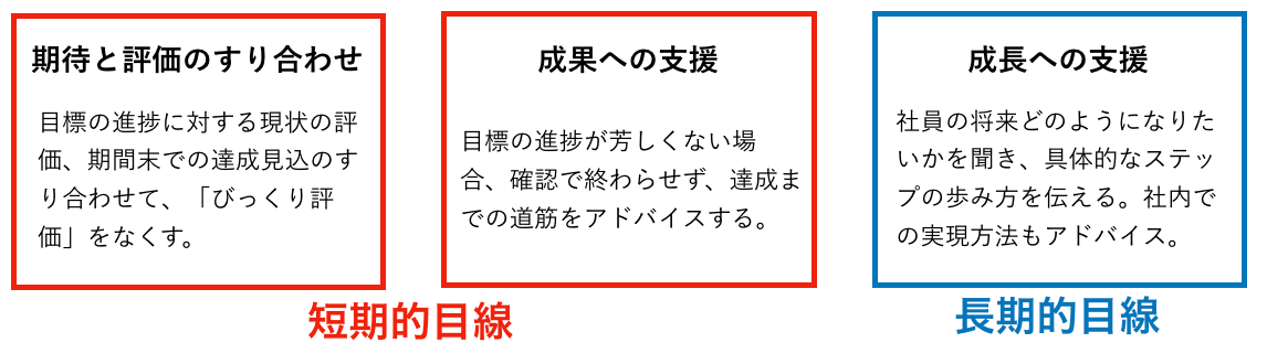 また1on1を実施して、目標への進捗が芳しくない、このままでは達成できないとなった時に、1on1をする側は社員に達成までの道筋をアドバイスします。現状の評価、進捗を確かめるだけで終わりません。これが二つ目の「成果への支援」です。