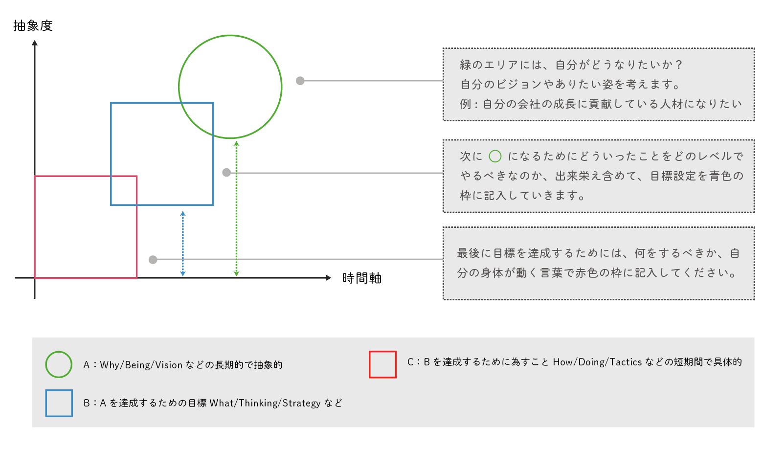 目標設定シートの3つの色分けしたエリアは下記の関係性です。それぞれのエリアが全てつながっていることがポイントです。