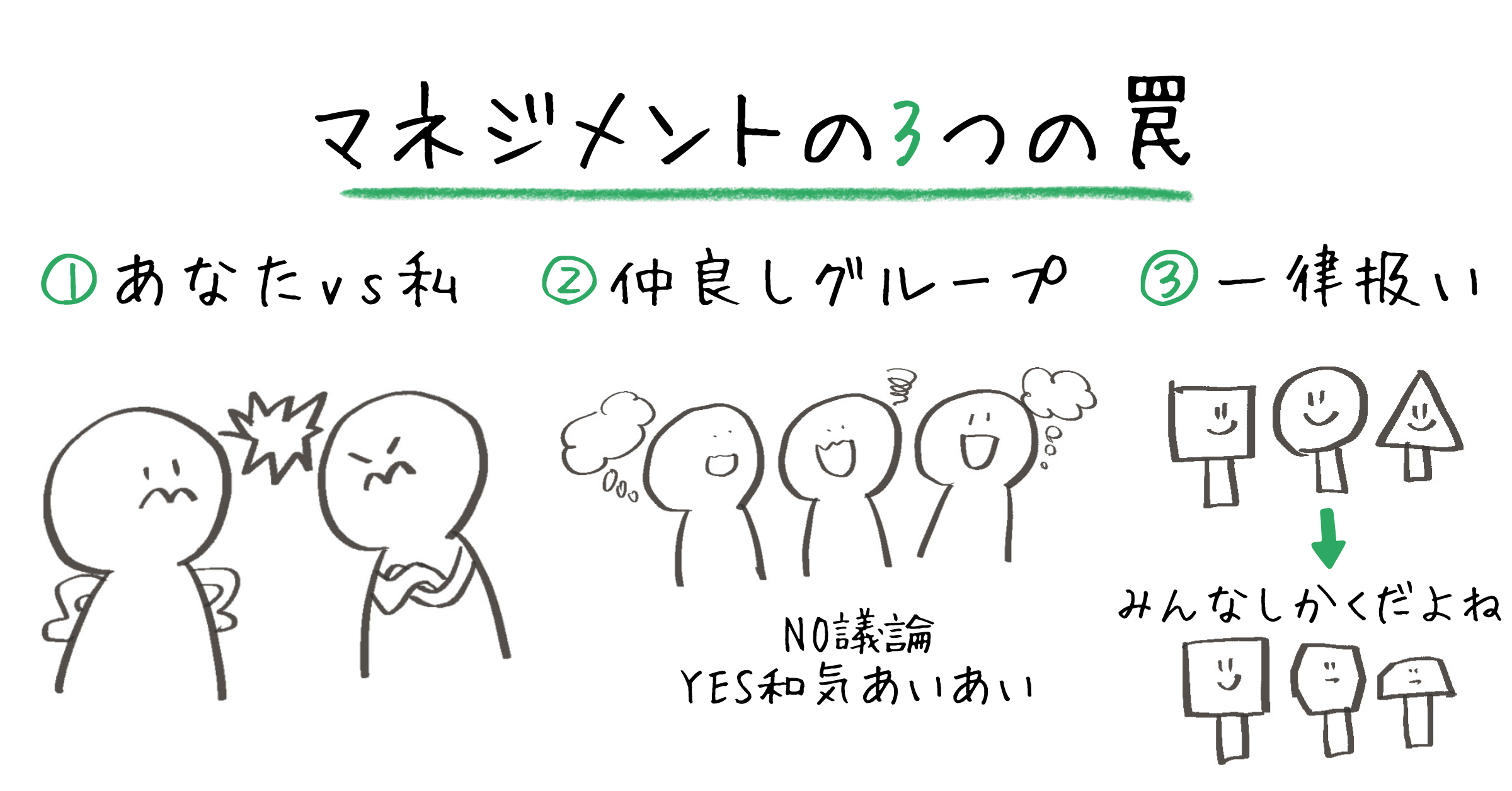 1つ目は「あなた vs 私」という対立構造の罠。 2つ目は「仲良しグループ」の罠。 3つ目は「個性を消して一律に扱う」罠です。