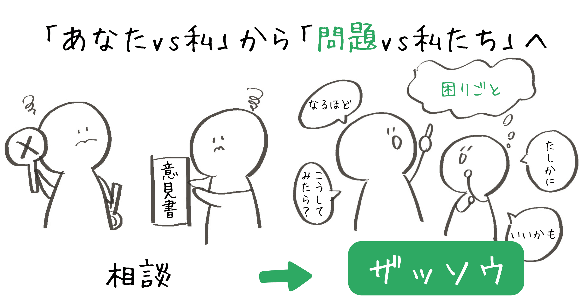倉貫: 対立構造を解消し、「問題 vs 私たち」という形に変えていくために有効なのが、ソニックガーデンが大切にしている「ザッソウ(雑な相談)」という習慣です。