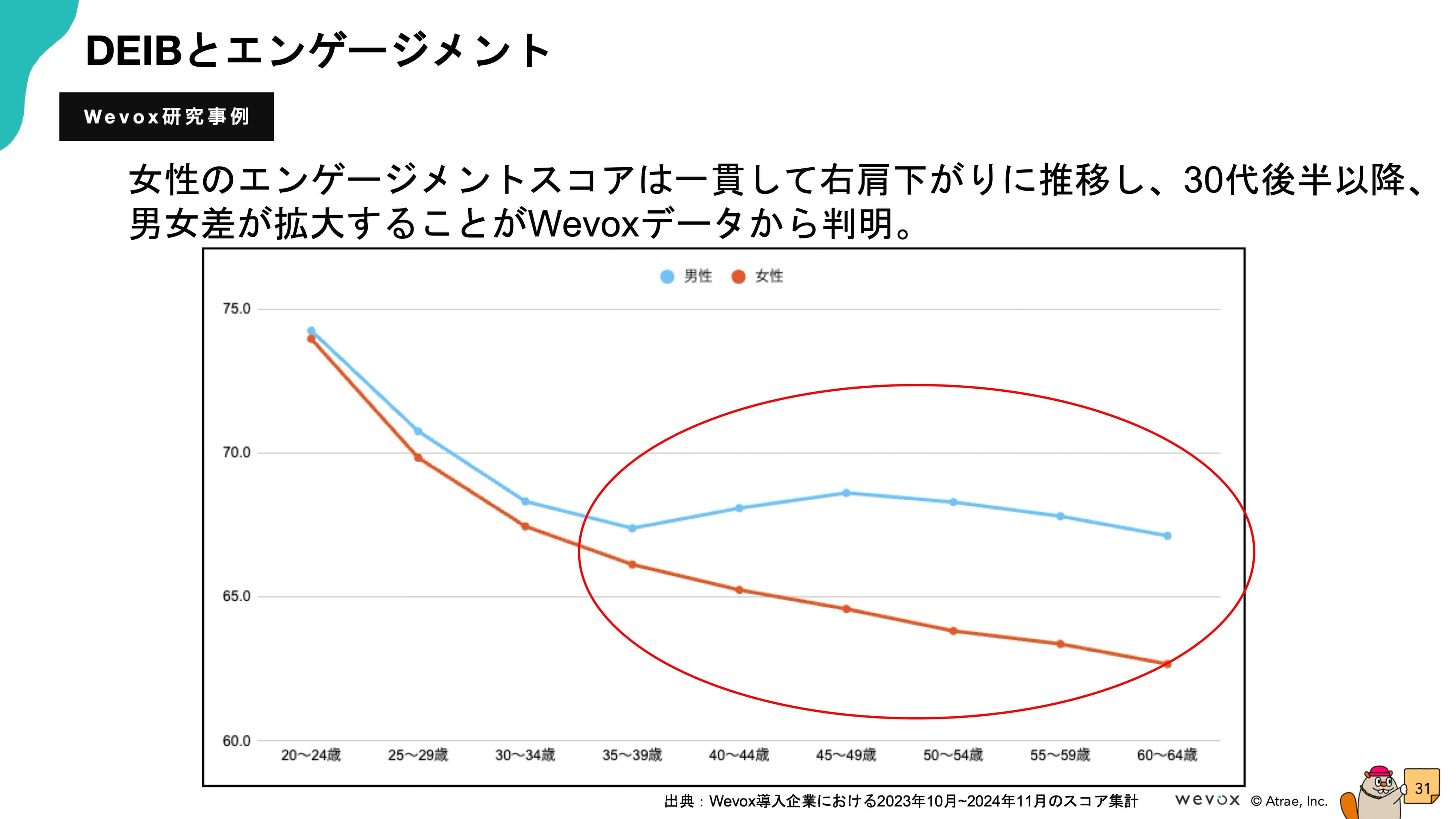 女性のエンゲージメントが30代後半を境に下がっていく傾向や、役職別に見ると男女ともに役職が上がるにつれてエンゲージメントが向上していくデータには、「信じられない」「衝撃的です」と驚きの声が上がっていました。