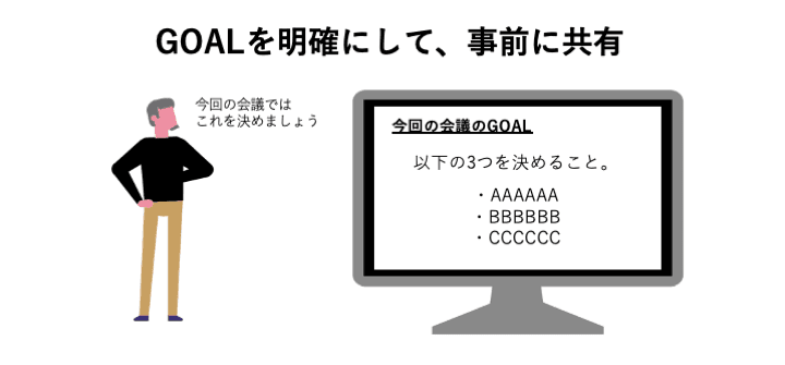 会議を始める前に、まず「その会議で何が決まればOKなのか」というGOALを明確にしておきます。GOALを決めた後、会議参加者に事前に共有して、認識を揃えてましょう。「何を決めるか」という目的が揃っていないと、参加者は何で呼ばれているかわからず会議へのモチベーションが湧きません。また、会議が始まってからGOALを説明しても時間を無駄にしてしまいます。必ず事前に明確なGOAL決めて、共有しておきましょう。