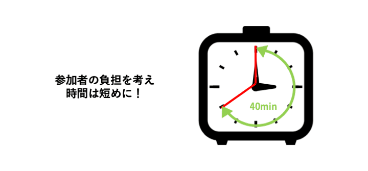 オンライン開催だと、参加者はパソコン画面の前から動けません。場合によっては、オフライン開催よりも体力を使い、集中力も切れやすいです。参加者のことを配慮して、会の時間を短く設定しましょう。アトラエでは通常2時間のATPFを、オンラインでは40分に短縮したそうです。