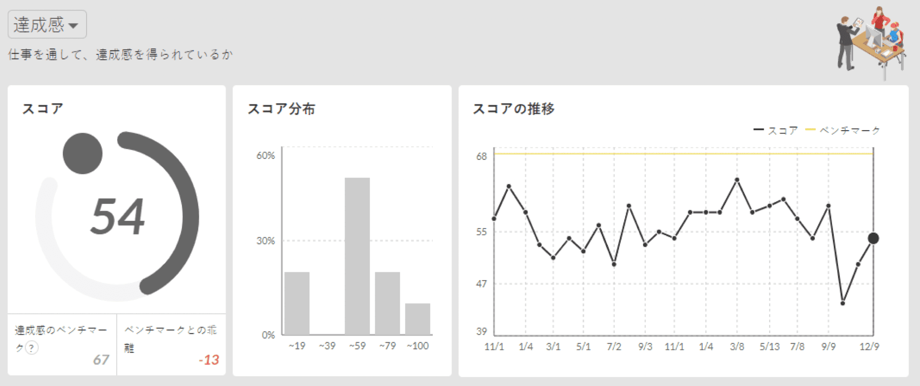 達成感についても、同様に44→50→54と改善が継続している。