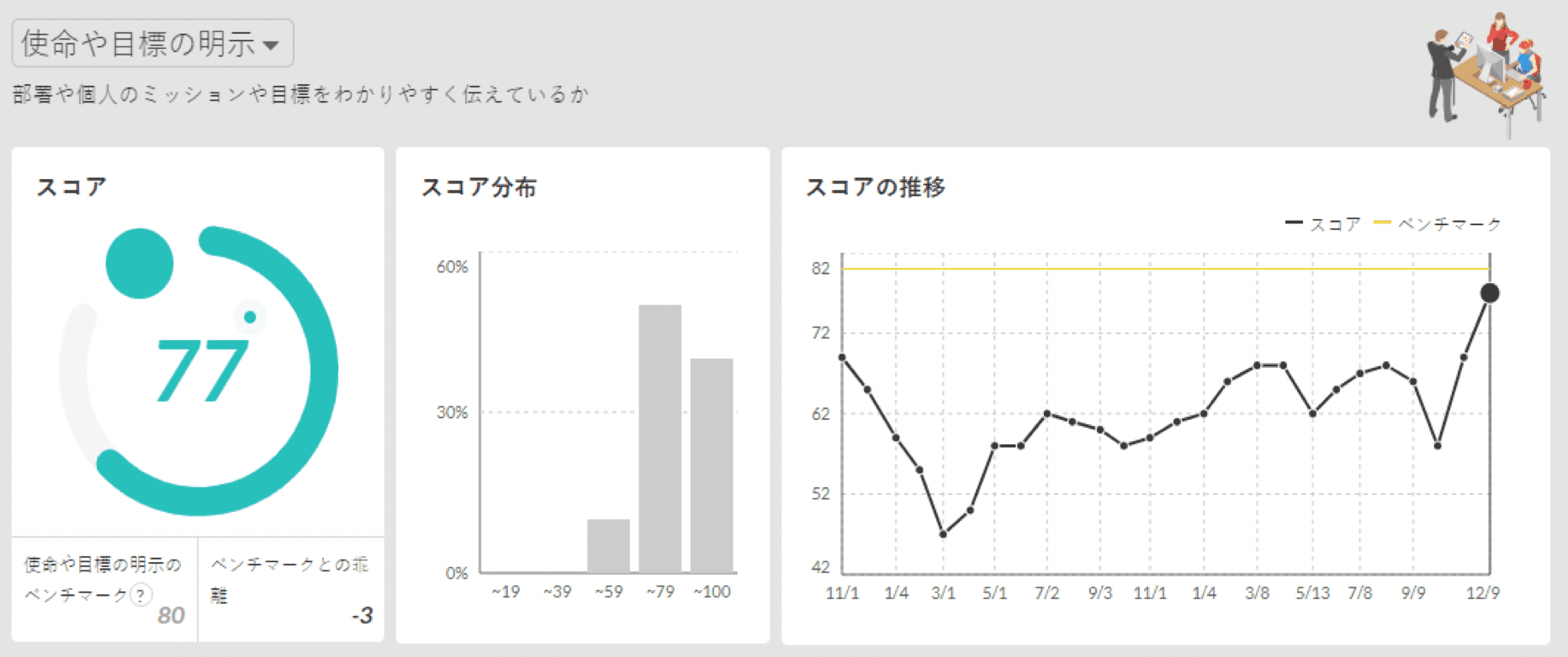 使命や目標の明示については、部署運営開始(2019年10月)以降、58→69→77と毎月改善傾向が続いている。