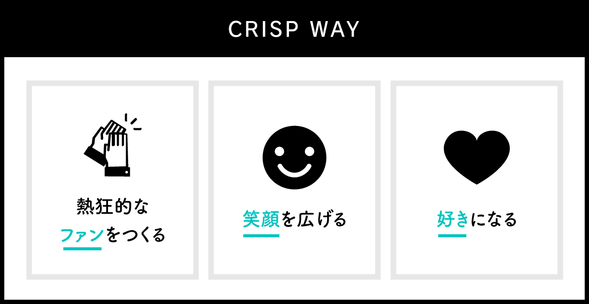なぜアルバイトに対してこれほど多くの施策を行っているのか、という理由は何度も、泥臭く説明して理解を得るようにしていますね。 理解をしてもらう上でいつも話しているのが「CRISP WAY」という3つの行動指針です。2つ目の「笑顔を広げる。」という部分を特に話します。