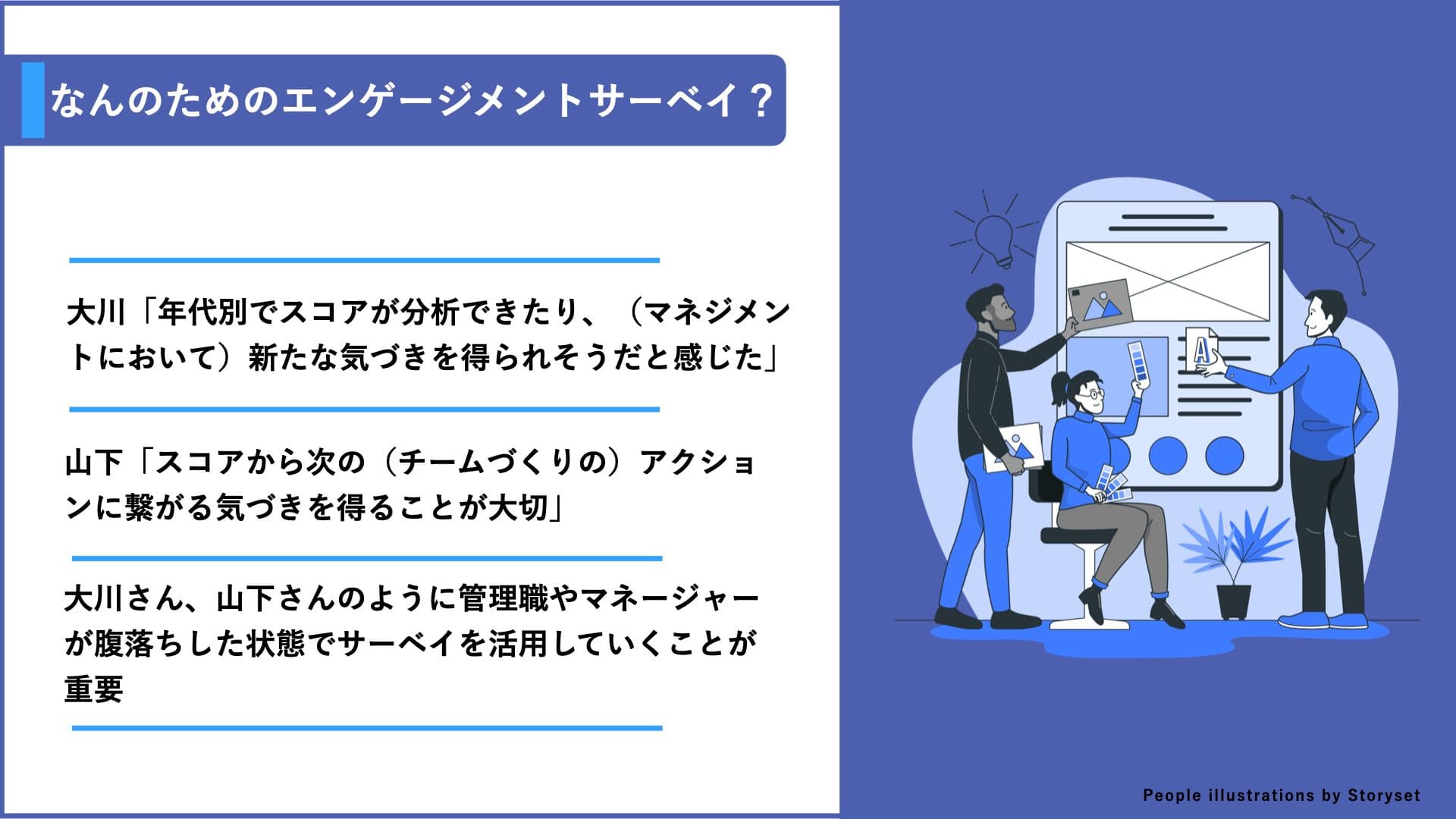 具体的には、1on1やチームミーティングの積極的な推奨や、Wevoxを用いたエンゲージメントサーベイなどをスタートさせています。今日は、グループ内でエンゲージメント向上に積極的に取り組む、2人のマネージャーの事例を共有することで、みなさんの組織づくりの参考になればと考えています。