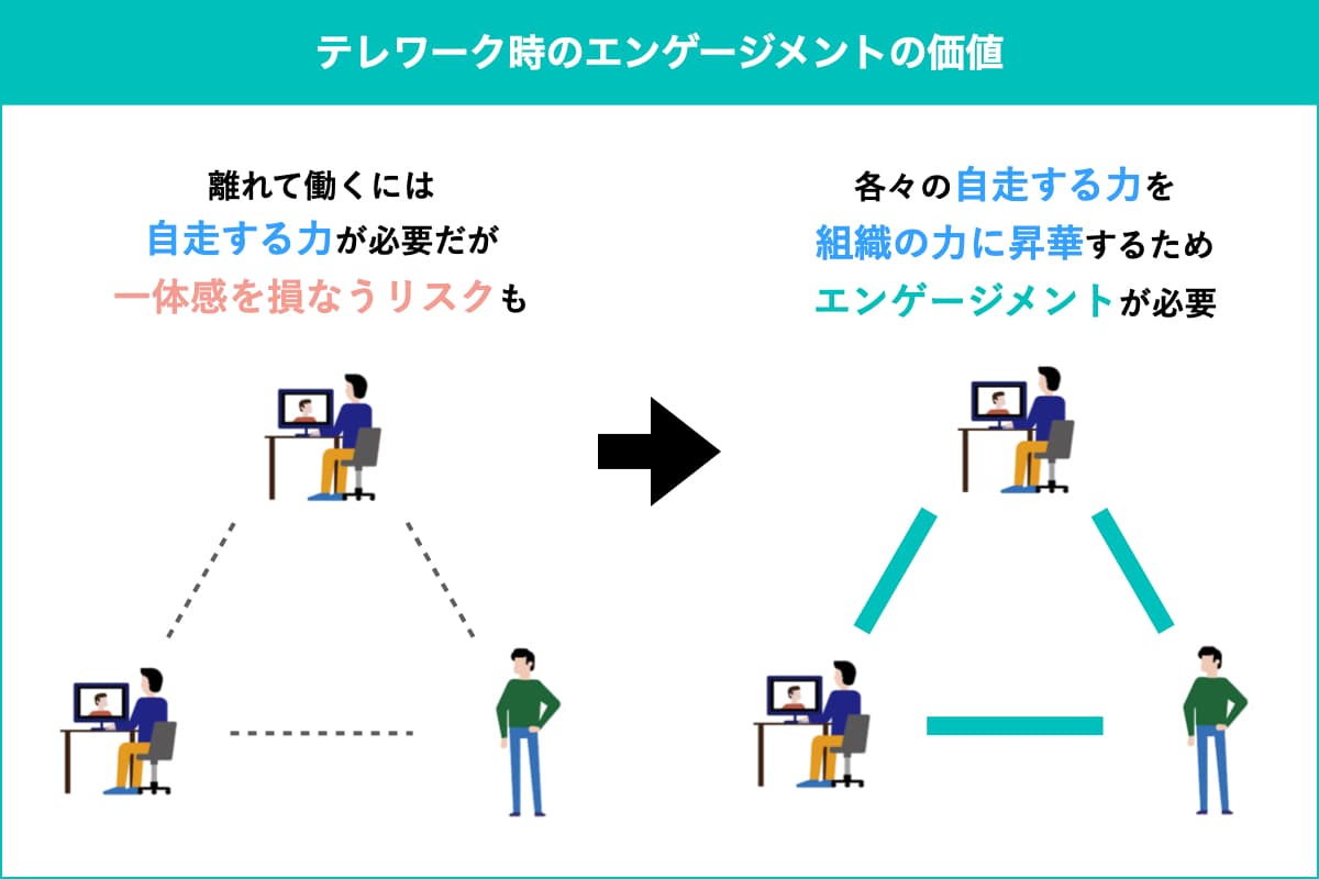しかし、それぞれが自走する力を持てば持つほど、組織としてのまとまり、一体感が損なわれるリスクもあります。各々の自走する力を、組織としての力に繋げ、高い生産性を実現する。そのために、まさに繋げる力としてエンゲージメントが増々重要になってくるはずです。