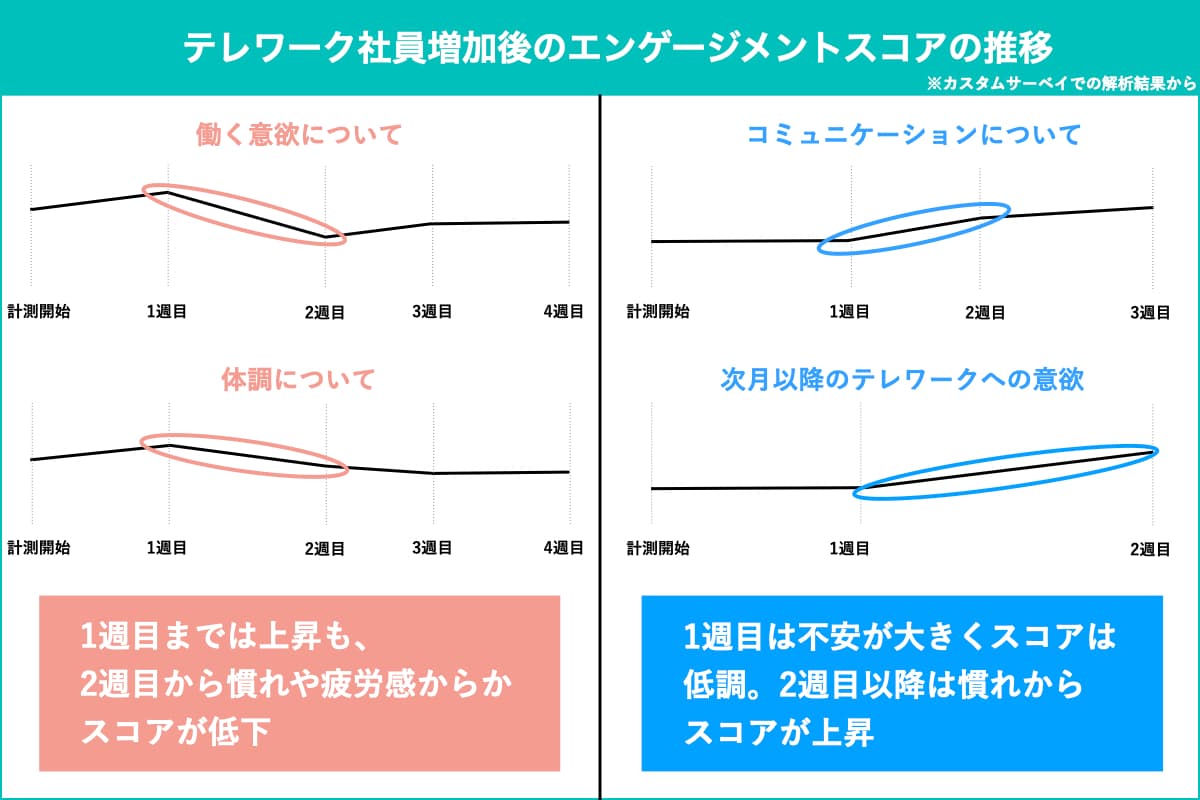 はい、グラフの推移のみになりますがお見せします。最初にカスタムサーベイをして1週間は「体調面」「働く意欲」はスコアが上がっているのですが、その後下降しています。おそらく、最初は少し物珍しい点もあって気にならなかったけど、徐々に疲れが出てきていることが推測できます。