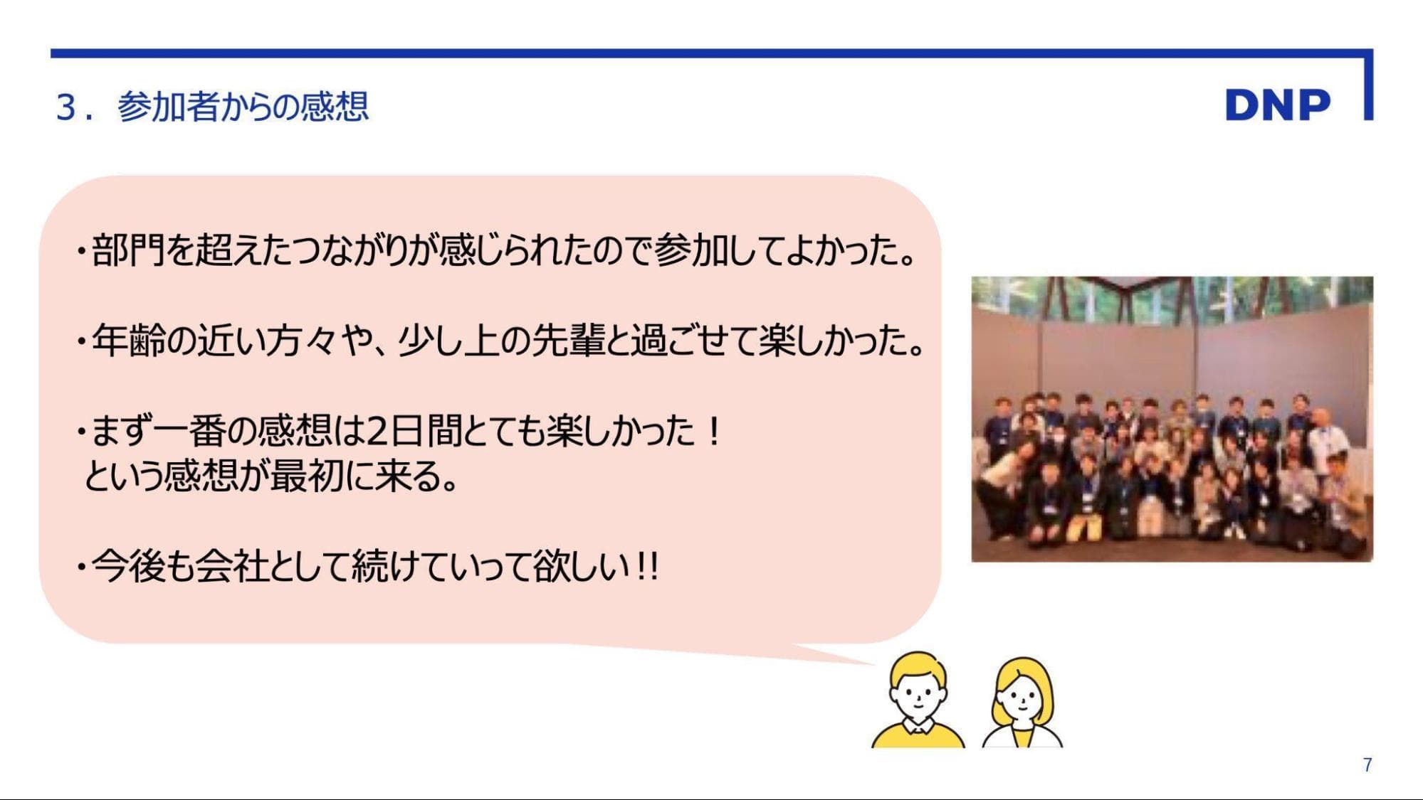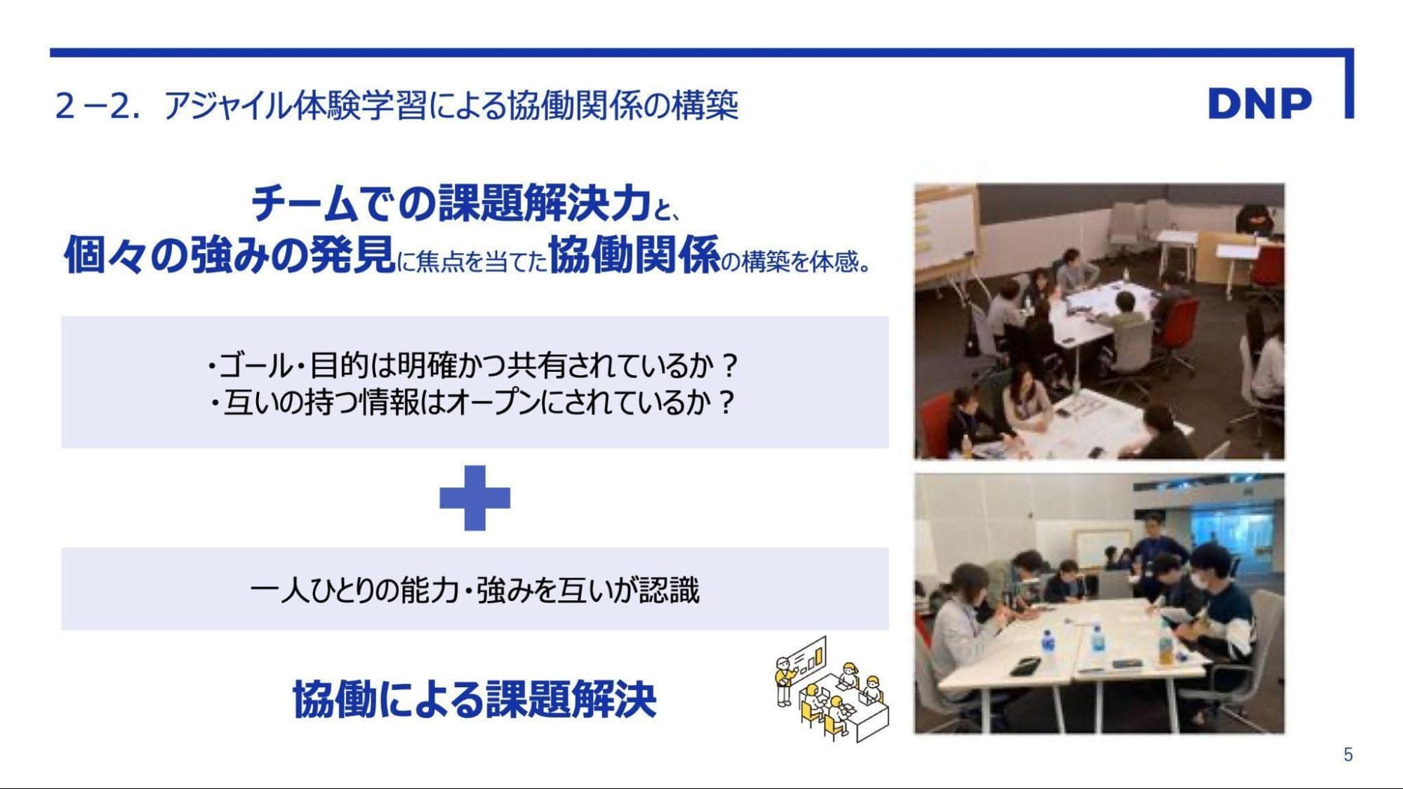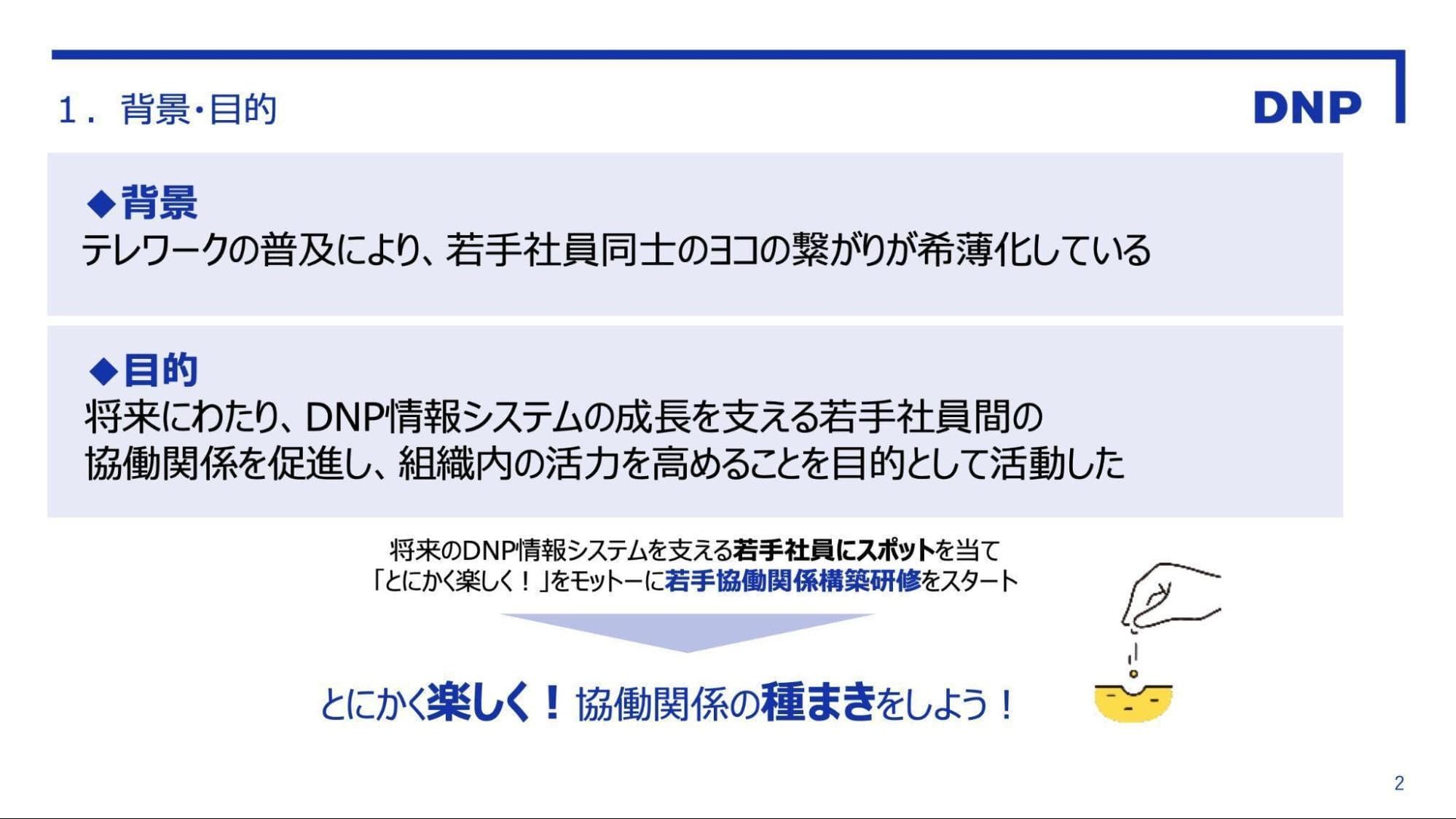 山田: DNP情報システム人材開発部の山田です。本日は「対話と協働で若手社員の繋がり強化!」について紹介します。