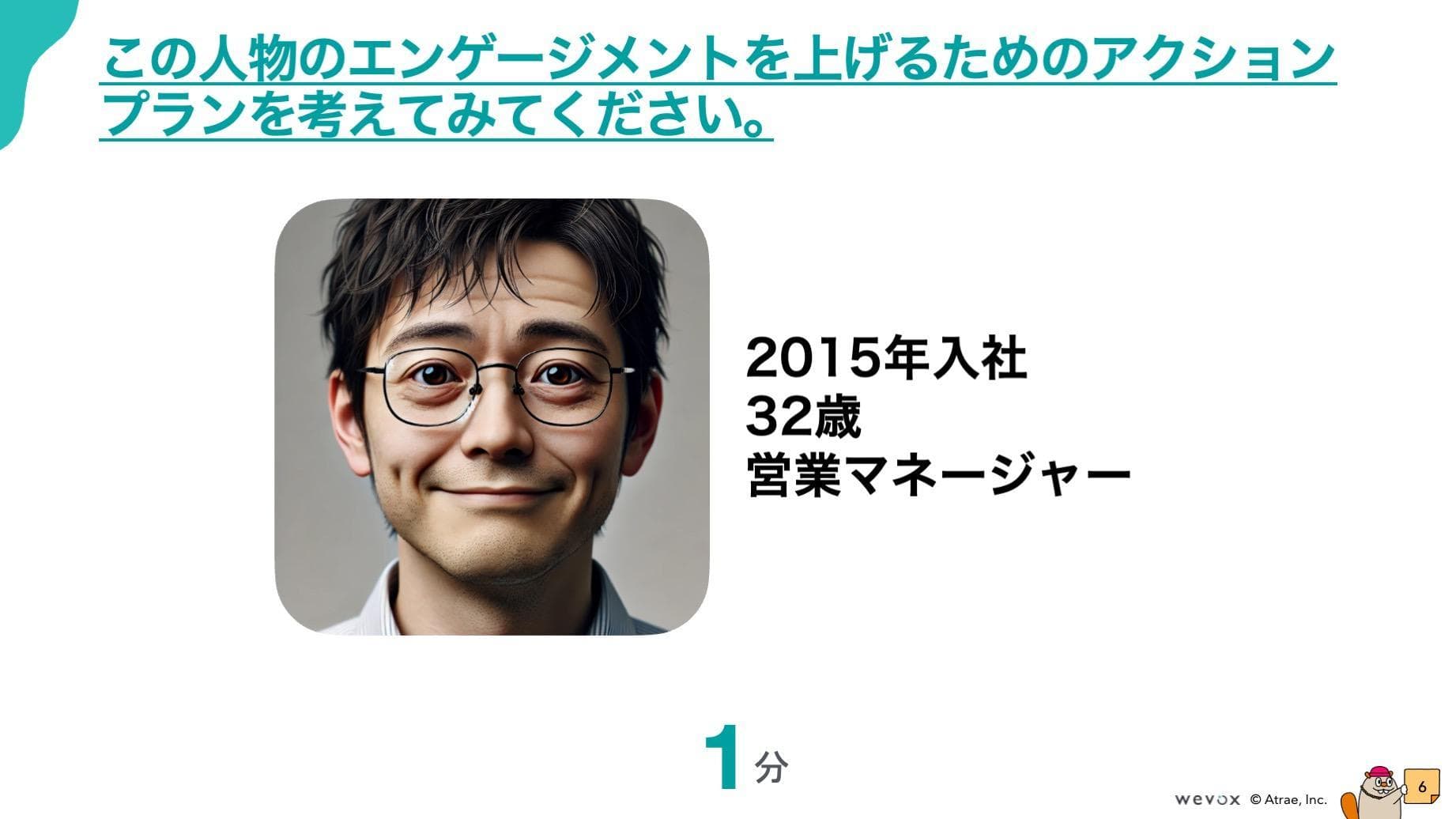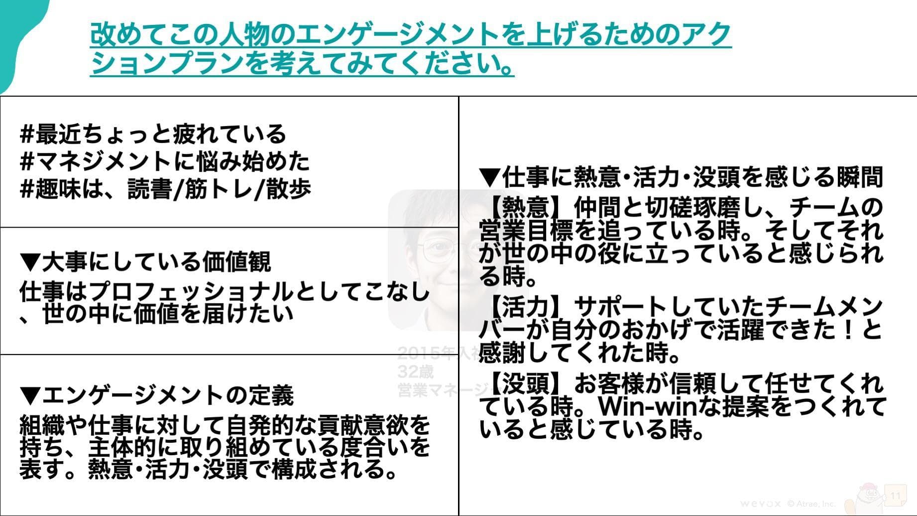 では、情報を小出しにします。「最近疲れている」「初めてのマネジメントに悩んでいる」「趣味は読書と筋トレ」「仕事はプロフェッショナルとしてこなし、世の中に価値を届けたい」。そして、この人にとってのエンゲージメントとは「仲間と切磋琢磨している時」「メンバーに感謝された時」だとします。