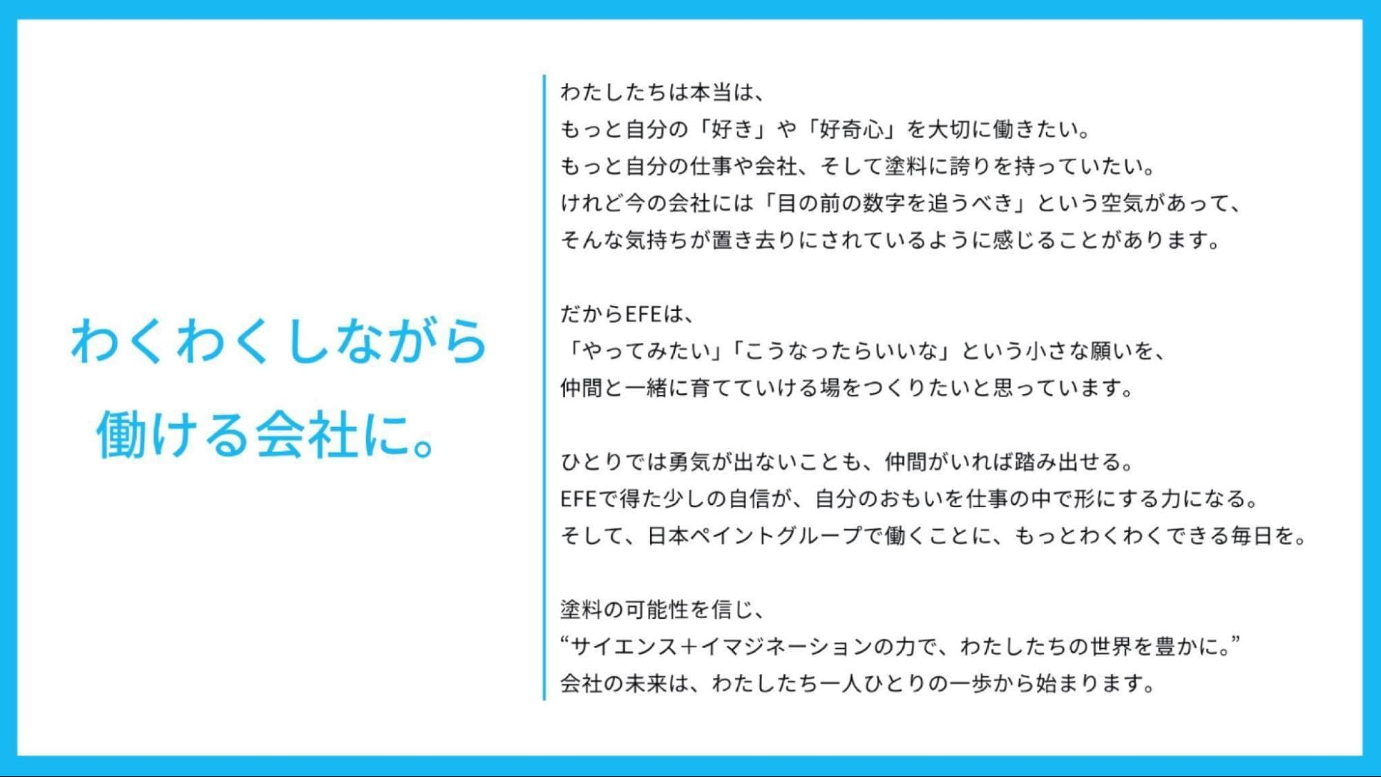 星野: 日本ペイントの星野と申します。私はこの会社に技術系社員として入社し、現在は労働組合の役員を担っています。本日はEFE(Engagement for Employee)という日本ペイントグループ公式社内コミュニティの事務局としてお話しします。
