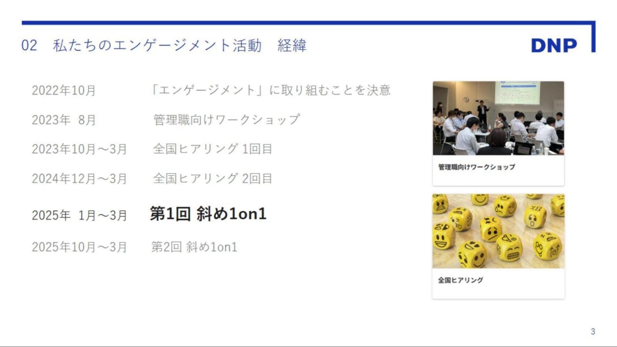 エンゲージメント活動は2022年10月からスタート。これまで、「管理職向けのワークショップ」や、本部員の声から課題の抽出を図ろうと全本部員へのヒアリング「全国ヒアリング」を行いまして、今回の斜め1on1(※)実施に至りました。