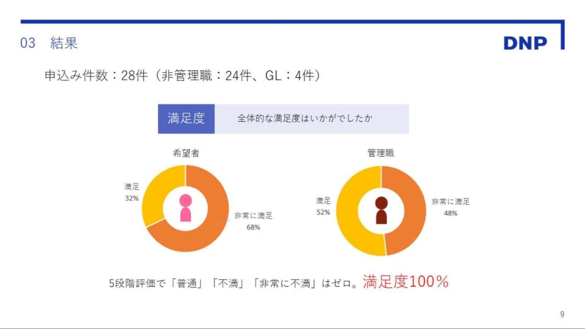 結果、申し込みは28件、満足度は100%となりました。目的は2つありましたが、目的1としていた「気づきを得る」では、「他者視点の重要性」だけでなく「自分の強み・弱み、価値観」など複数の気づきにつながりました。また、目的2の「関係性と挑戦の醸成」についても8割以上が効果を実感してくれました。