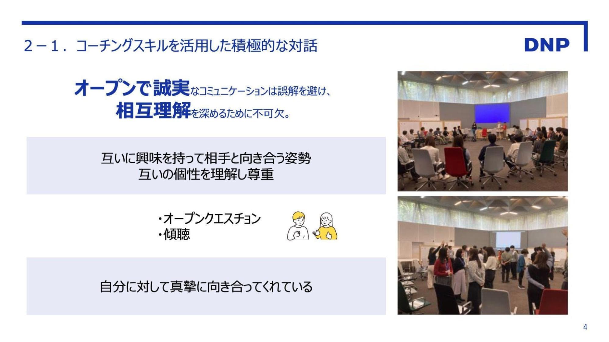 コーチングを活用した対話は事柄にフォーカスするのではなく、相手の背景や思いを丁寧に聴くので、相手との信頼関係を築くことができます。参加者の自己開示を促し、関係構築の土台を作りました。