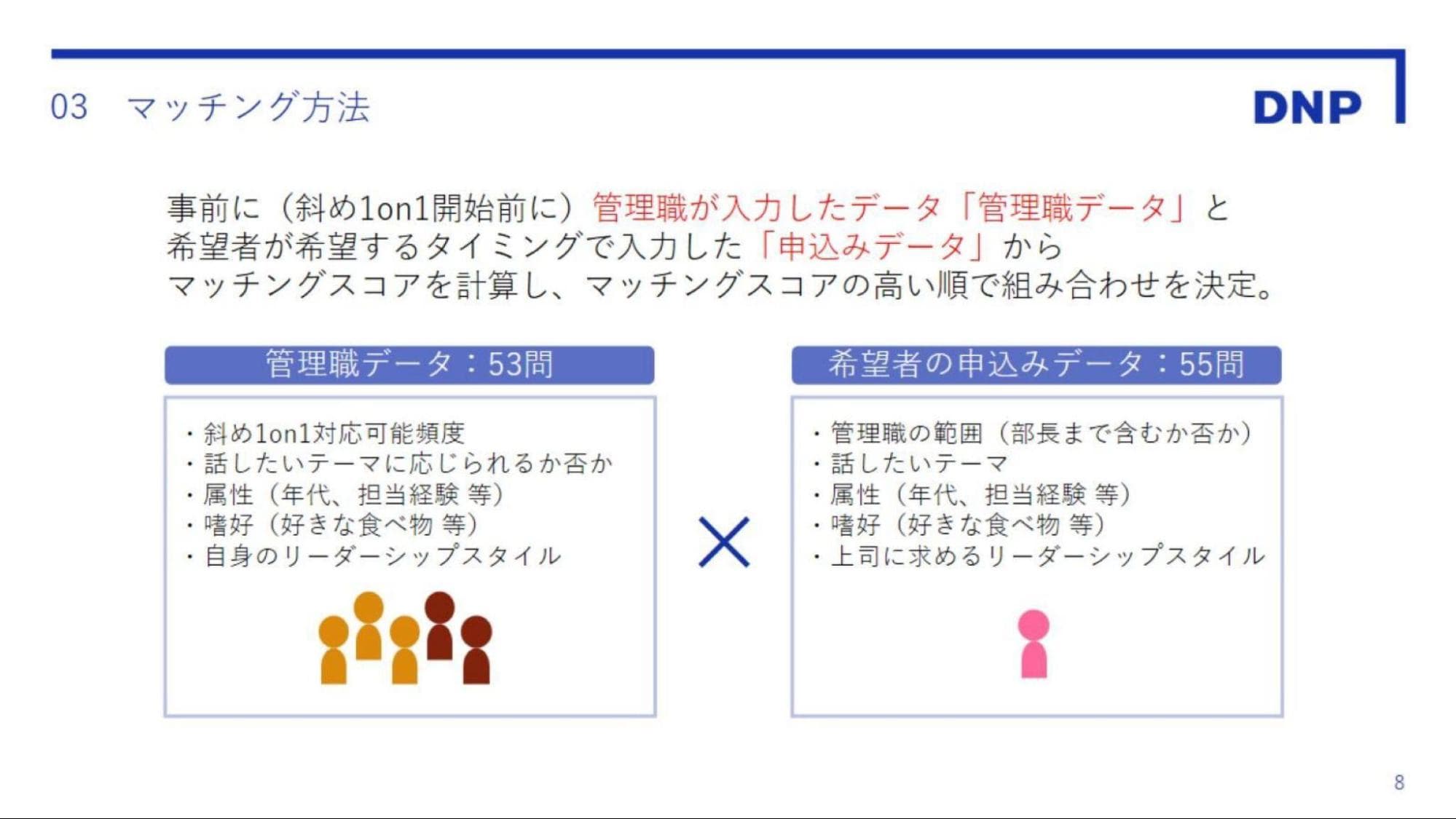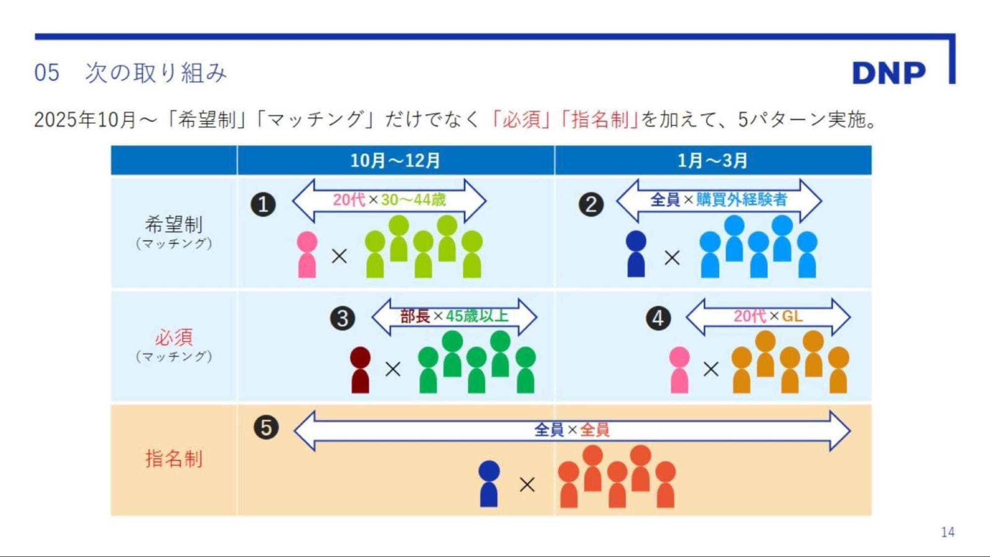 伊藤: DNP購買本部の伊藤と申します。本日は「関係性向上とチャレンジにつながれ! 希望制&マッチング形式の斜め1on1」について紹介します。