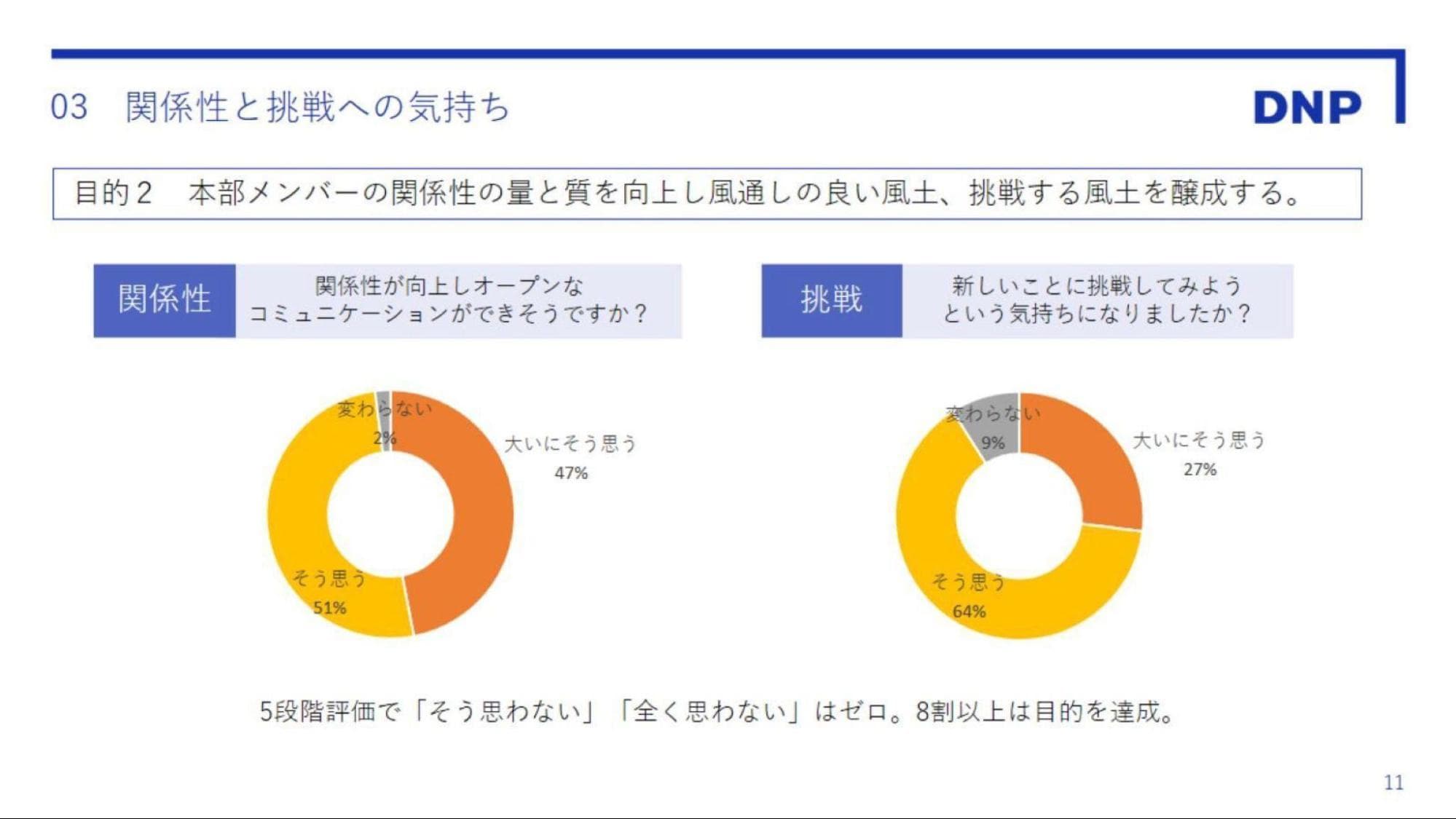 DNPでは4年前からエンゲージメントサーベイを行っており、ボトムアップの活動やDVO制度(※)が機能しているチームは、エンゲージメントスコアも高い傾向にあります。課題としては、その活動をやっているところとやっていないところで、二極化してしまっている点です。その辺りの底上げをやっていきたいと考えています。
