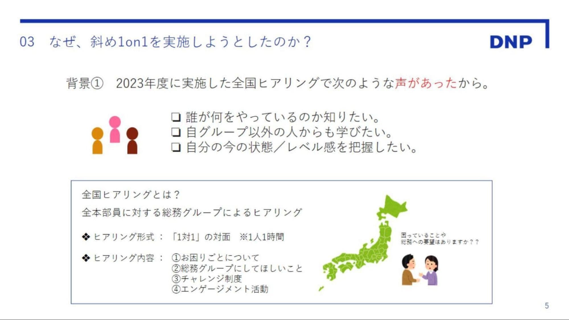 まず、斜め1on1を企画した理由は、全国ヒアリングで「自分のグループ以外のメンバーと対話する機会が欲しい」という要望を受けたからです。
