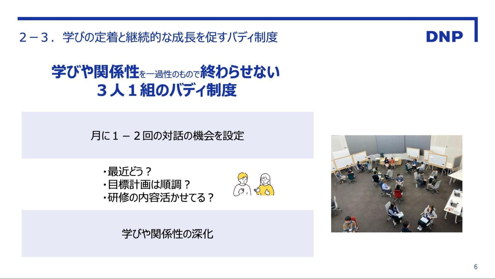 最後に、学びを定着させるための「バディ制度」です。3人1組で月に1〜2回集まり、近況や目標の進捗を話します。バディ制度の必須期間は3ヶ月としましたが、その後も続いているチームもあります。
