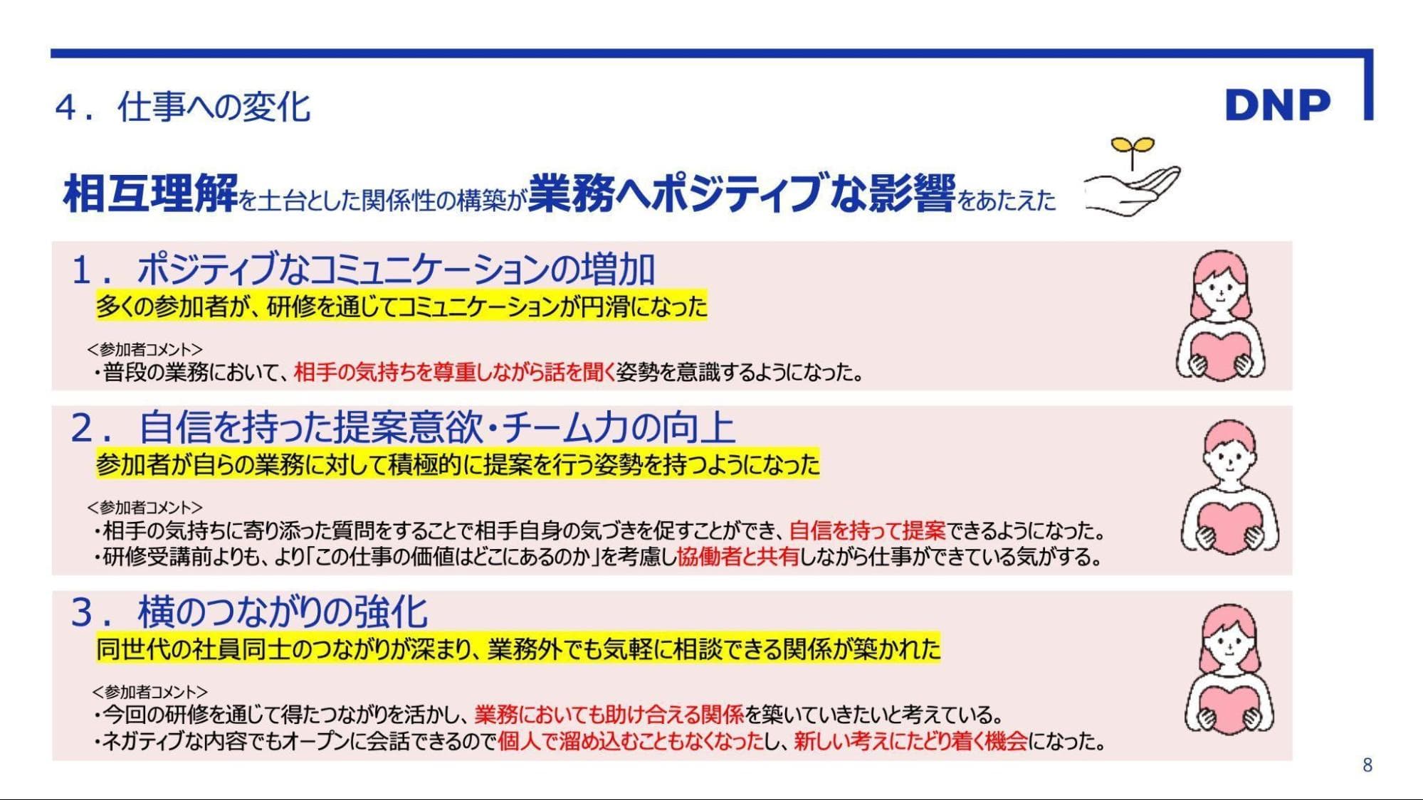 これらの取り組みの結果として、参加者同士だけでなく仕事においてもポジティブなコミュニケーションが増え、仕事では顧客に対して自信を持って提案できるようになり、仕事以外でも同世代で気軽に相談できる関係ができました。