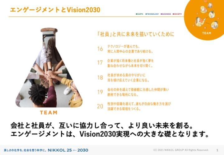 それと同じタイミングで、グループの「10年ビジョン(Vision2030)」がリリースされました。そこでは「従業員と会社の関係はタテからヨコに(対等)になり、双方がお互いに協力しながら新しい価値を作っていこう」とか「会社は社員にとって自己表現・自分らしさを発揮する『場』である」といったことがあるべき姿として描かれていたんです。