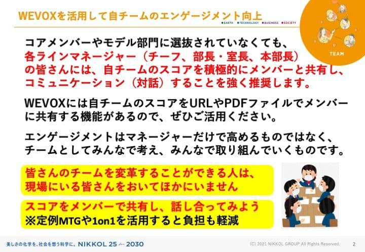 Wevoxの導入は2020年の10月です。プロジェクトからは「そもそもエンゲージメントとは何か」「Wevoxは何のためにあるか」など色々な情報をグループのメンバー全員に定期的に発信しています。