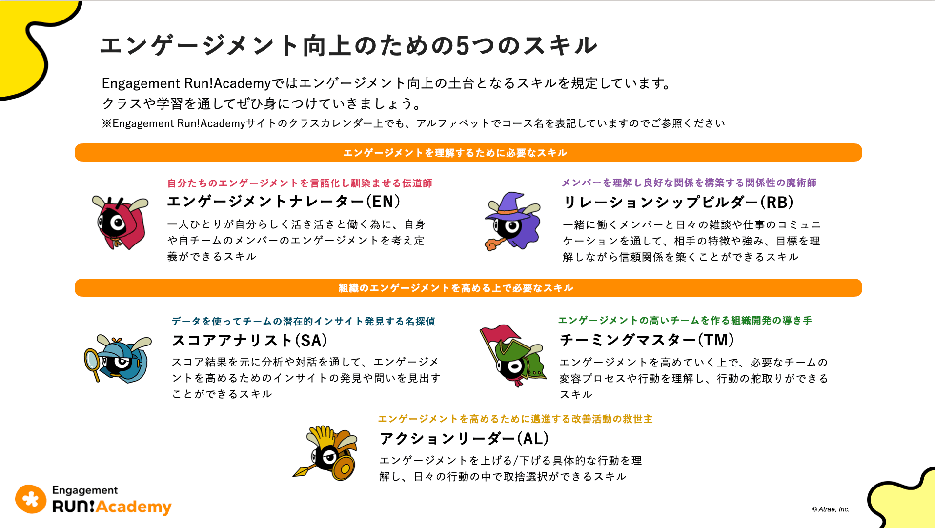 平木:加えて、エンゲージメントを高めるための「5つのスキル」という枠組みを作りました。具体的には、それぞれのスキルに対してレベルを設定し、そのレベルを上げていくためのクラスを用意したんです。受講いただく皆さんにとって価値ある時間になるよう、充実したクラス設計は常に意識しています。