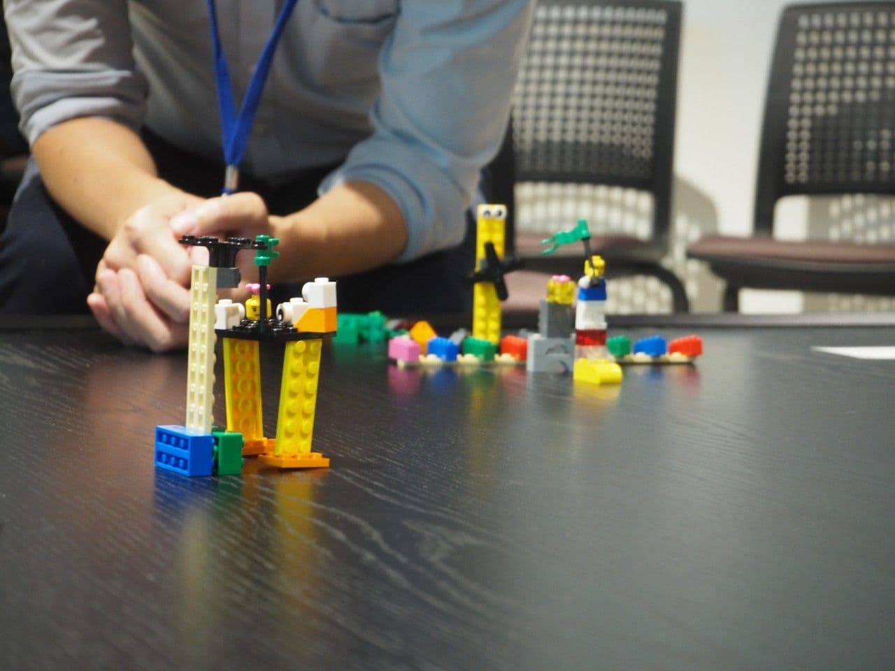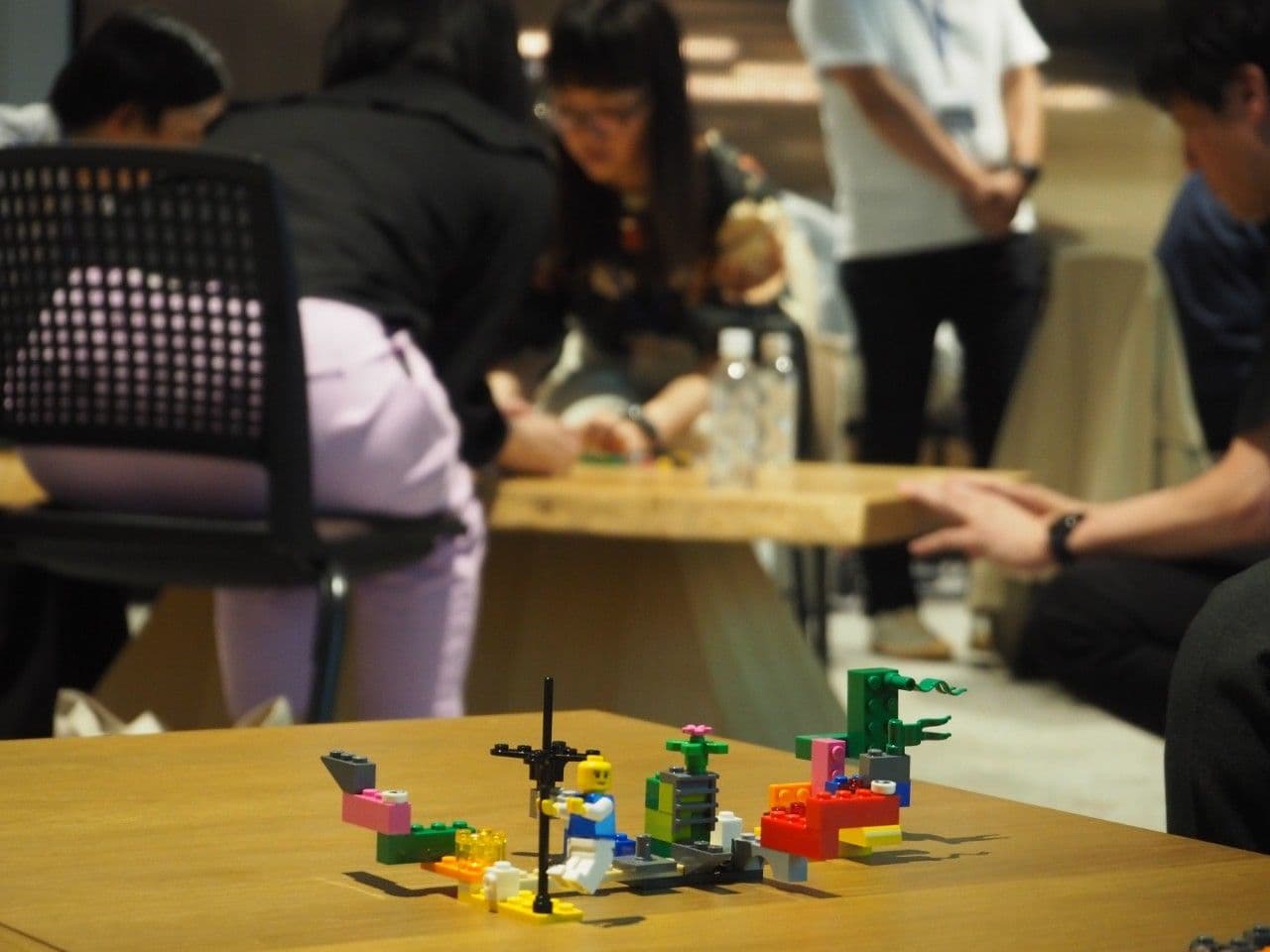 今回のワークショップでは多くのワークがありましたが、その中では自分の好きなブロックを10個選び、「未知の生物」を作るワークもありました。個人ワークでは、皆さんレゴを触りながら、真剣な眼差しです。その後、その「未知の生物」を使って、「自分の仕事」を説明していきます。真面目な話のチームもあれば、笑い声が聞こえるチームと多様でした。