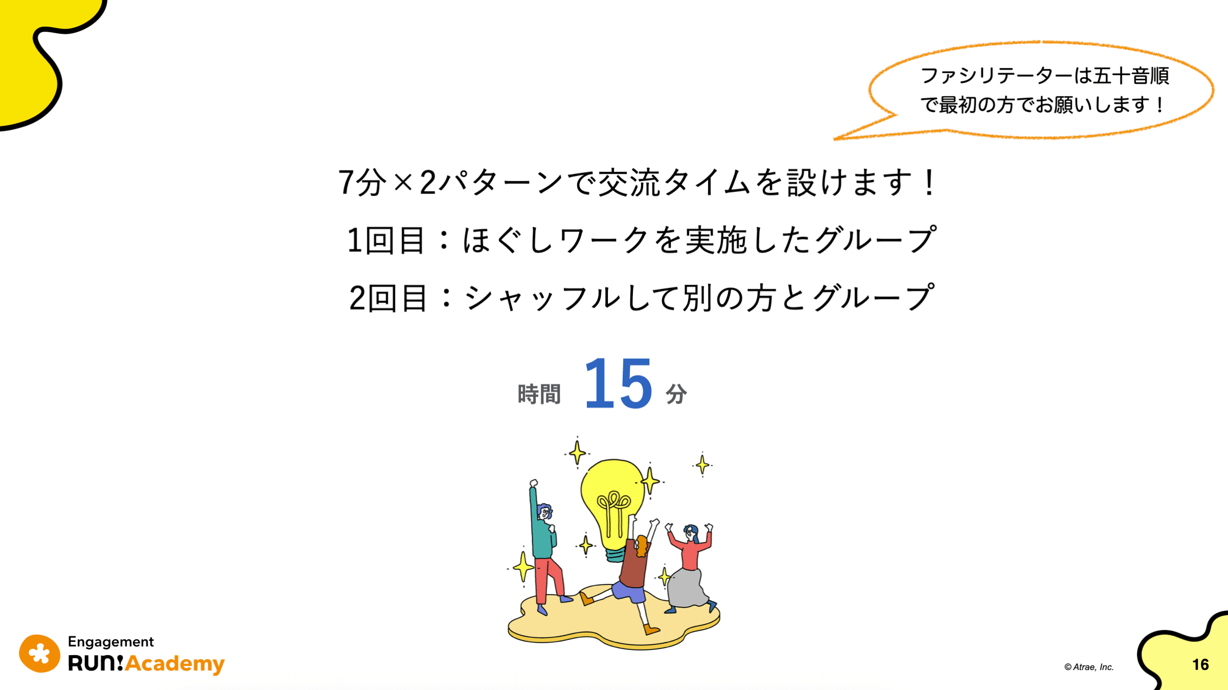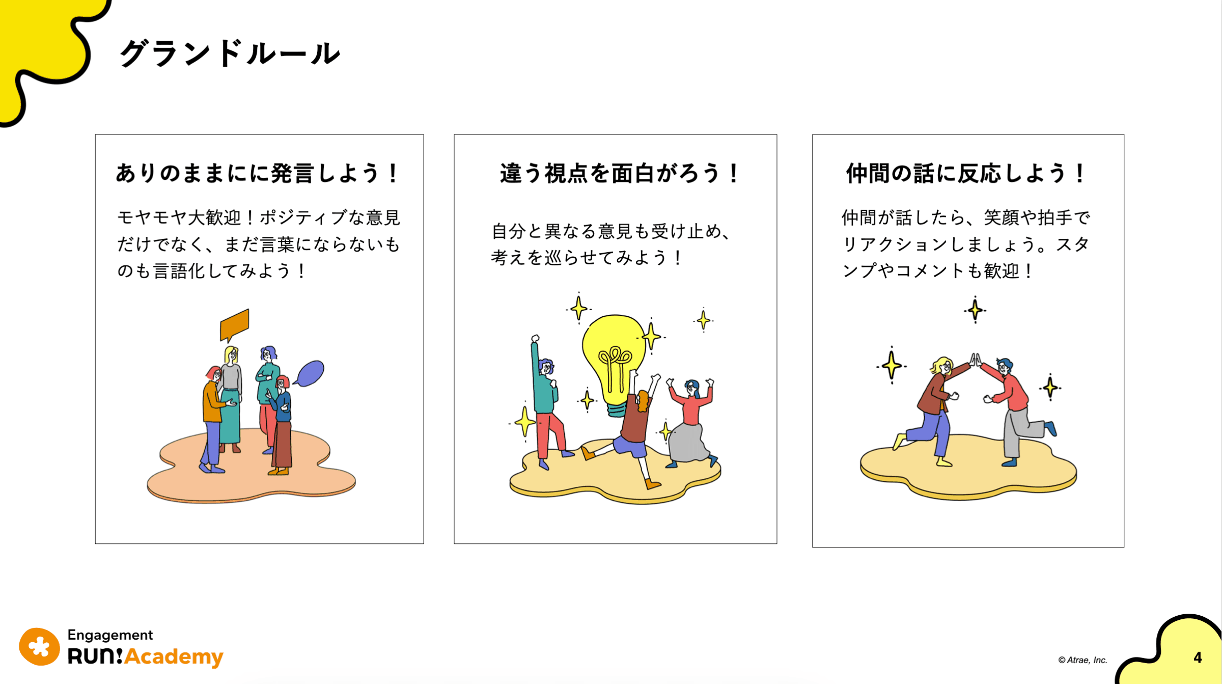 Engagement Run!Academyと言えば、クラス冒頭でいつもお伝えしているグランドルール!そのクラスをどんな場としたいか、我々からのメッセージでもあります。卒業生の皆さんは、日頃からこういったスタンスを大切にされている方々なので、釈迦に説法感はあるのですが、WevoxやAcademyらしさを感じていただける一つとして、お話させていただきました。当日ファシリテーターを務めた新家もニヤニヤ気持ちが入りつつ、お伝えしていました。