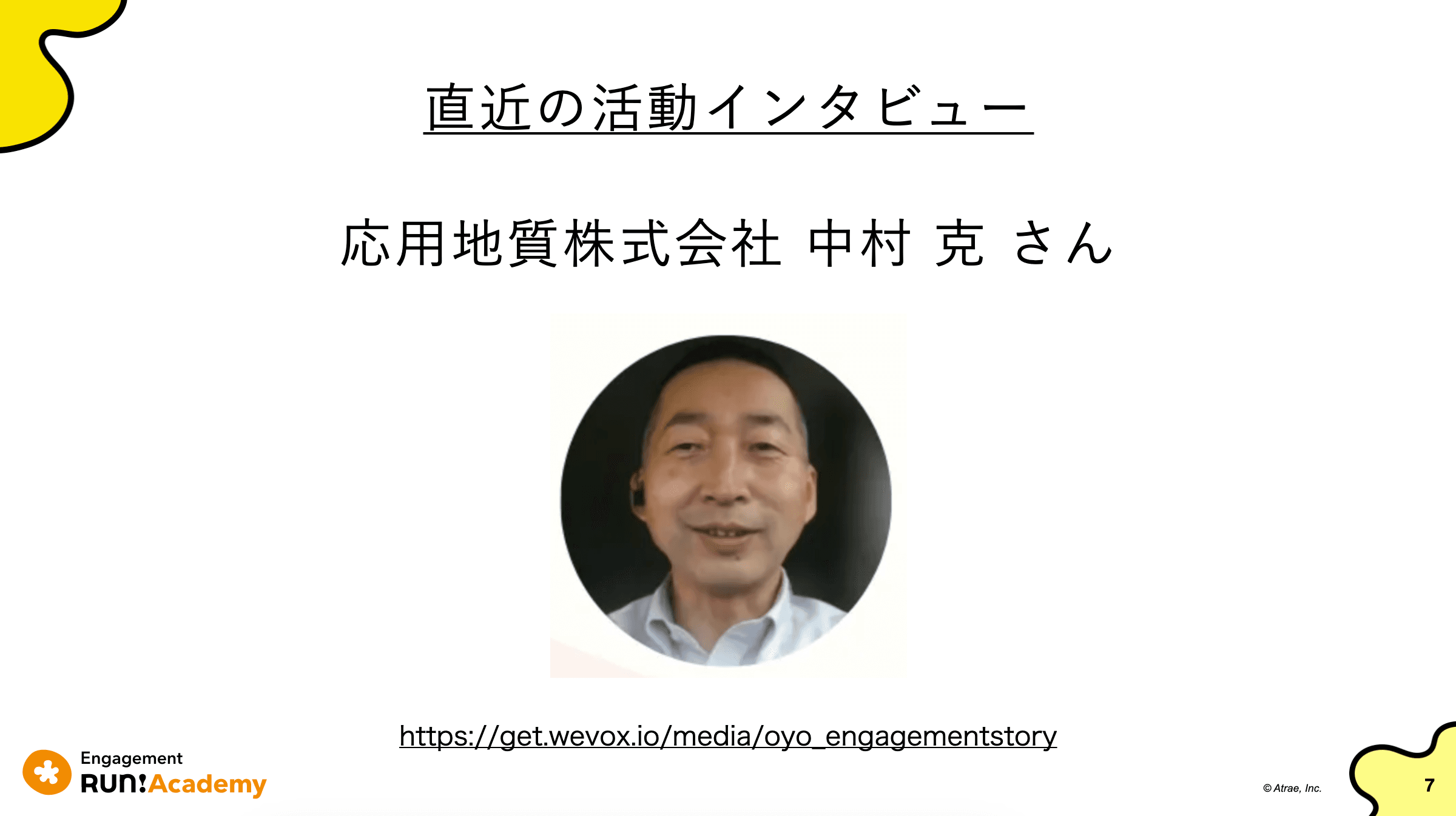 さて、前置きが長くなりましたが、「わかちあおう」を合言葉にスタートした交流会ですが、卒業生のお一人、応用地質株式会社中村さん(2022年3月より半年間Engagement Run!Academyを受講)に直近のご様子をインタビューしました!中村さんには、過去一度インタビューさせていただいたことがありますので、ぜひこちらもご参照ください。