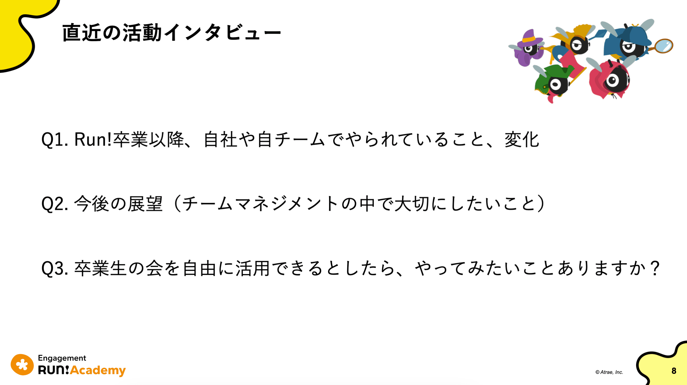 Engagement Run!Academyをご卒業後、それぞれ自社でご活躍されていらっしゃる皆さん。開始時間近くになると、続々とZoomに入室され、「お久しぶりです!」「お顔を拝見できて嬉しいです!」と和やかなやり取りが溢れるスタートとなりました。