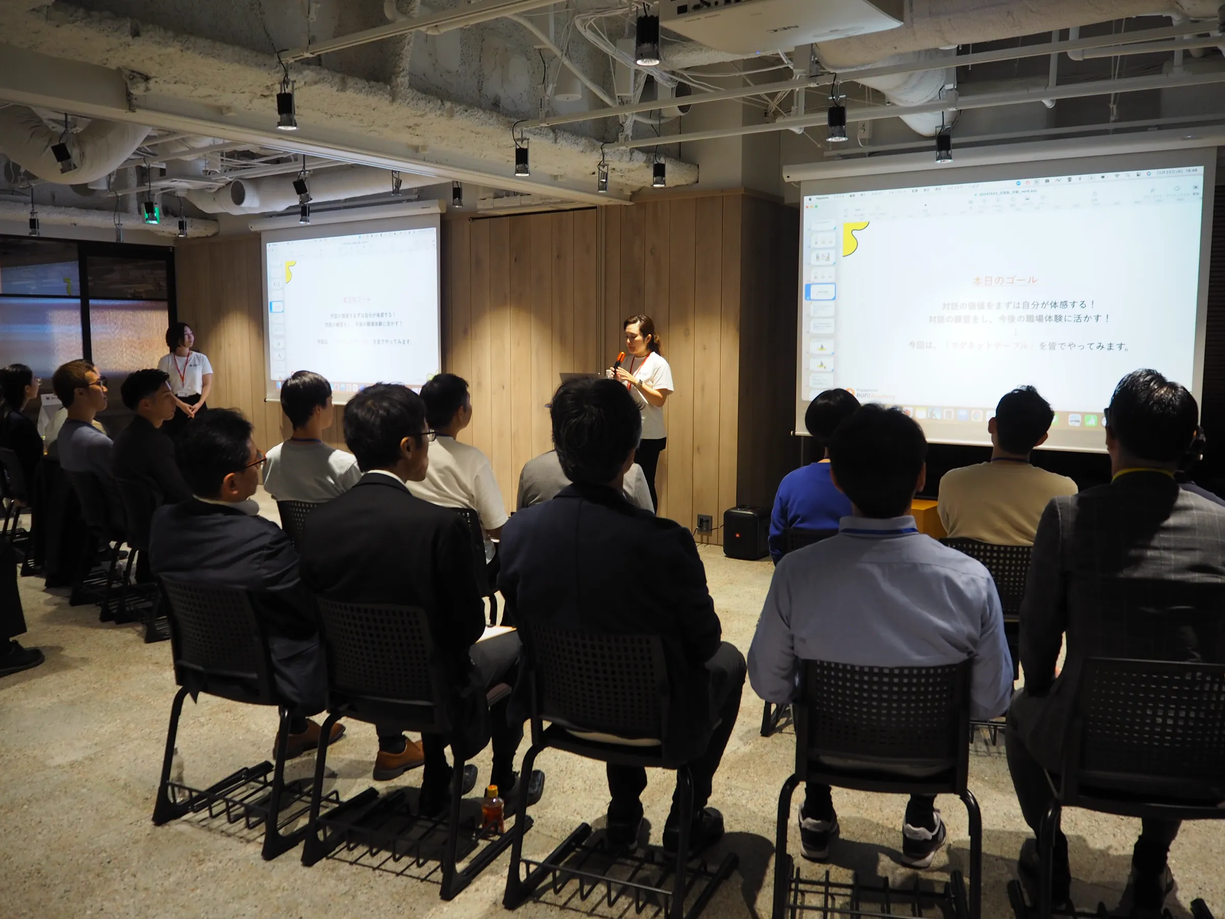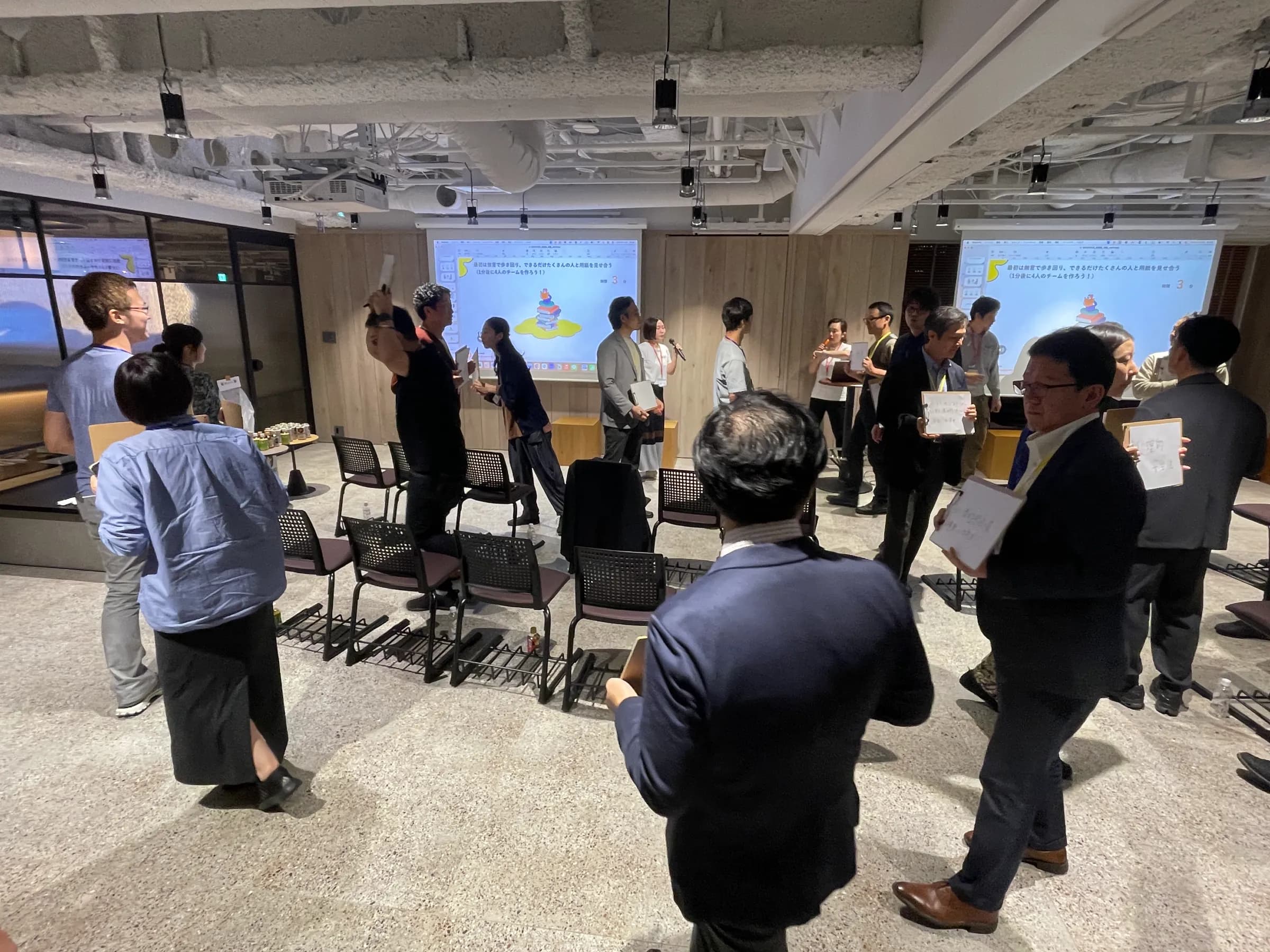 会の冒頭では、普段職場ではやることもあまり多くないであろうハイタッチを使った簡単な自己紹介ワークを実施しました。最初は皆さん照れながらでしたが、やっていく中で会場の熱量も徐々に上がっていきます。