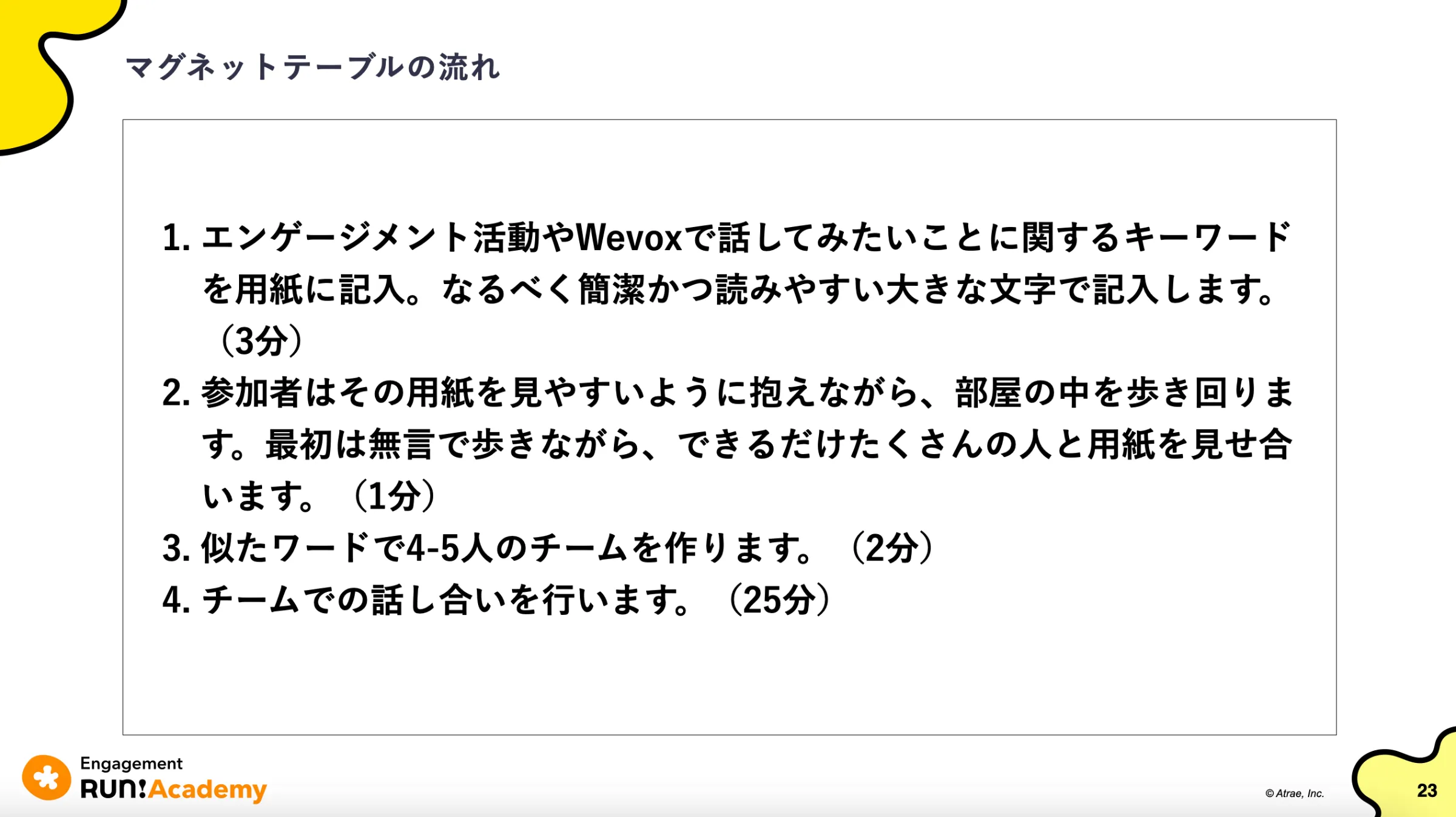 アイスブレイク終了後、『マグネットテーブル』を早速やってみました。『マグネットテーブル』とは、参加者が主体的にテーマを提案し、それを軸にグループを作りながら対話を深めるワークショップ手法です。テーマもチームも自らが決めることから、参加者の主体性を引き出しやすくなるのが特徴です。エンゲージメントでは、よく主体性の話や言葉が出ますが、主体性を育むヒントにもしていただければと思い、このワークを選びました。