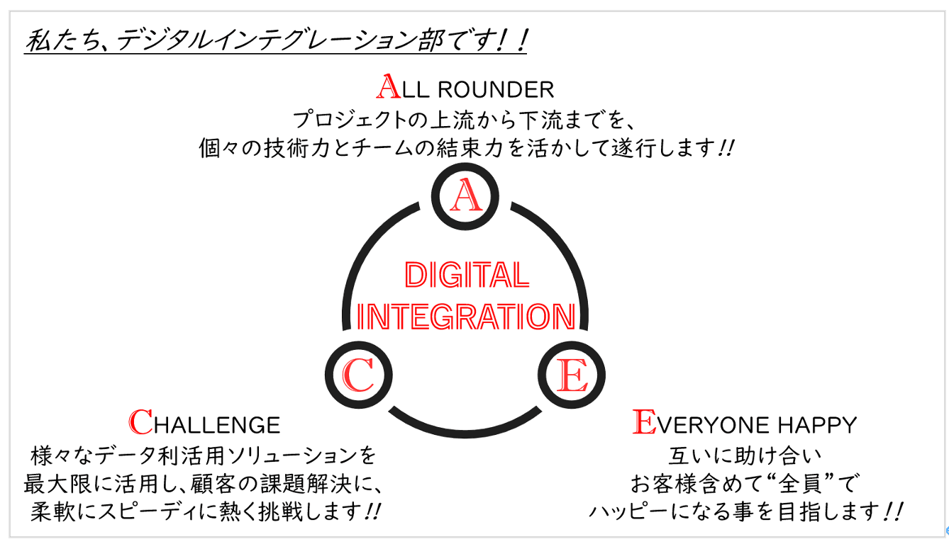 友杉:こうして、「DI部として共通認識を持とう」という目標に向けて、徐々にテーマが仕事寄りにシフトしていきました。そして、1年弱の議論を経て最終的にでき上がったのが、「①皆がハッピー(Everyone is happy)」「②新しい技術への挑戦(Challenge to new technology)」「③オールラウンダー(All-rounder)」というDI部の3つのShared Valueです。英訳の頭文字をとって「ACE」というイメージ図もつくりました。