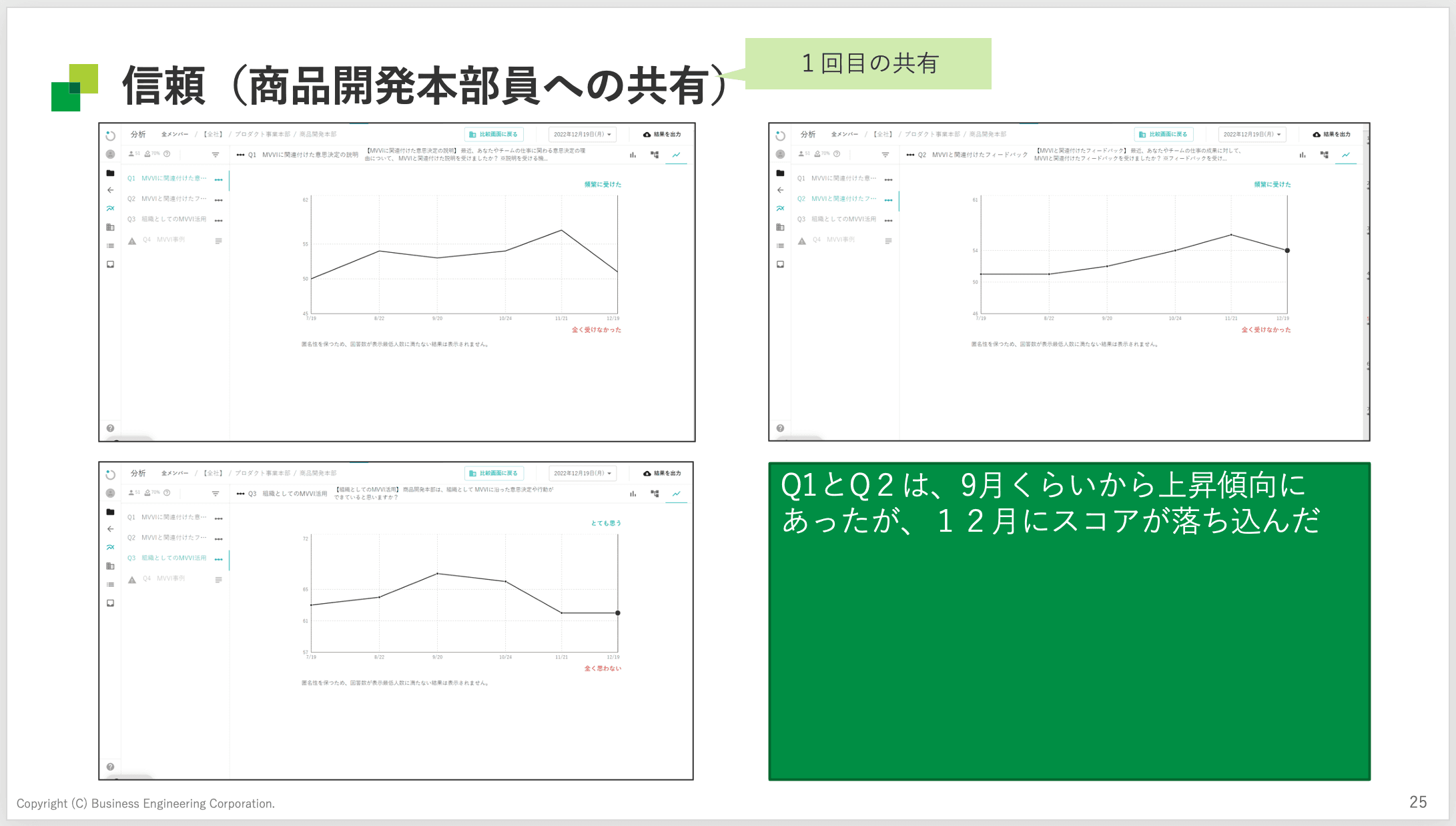 別役:Wevoxのカスタムサーベイの結果を見ていると、スコアの変化はチームによるのかなと。ただ、部分的に見れば下がっているように捉えられる点も、全体で見るとスコアが高くなっているので、MVVIを意識してくれている人が増えてきた証拠なのかなとも思っています。