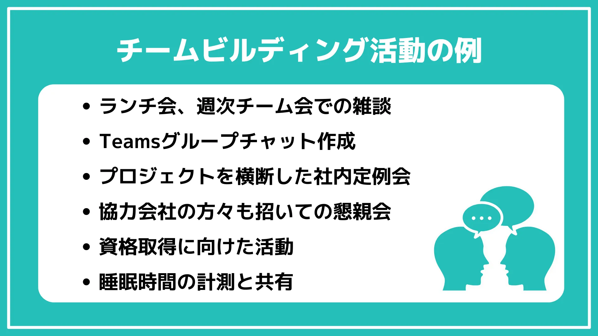 具体的には、ランチ会、週次チーム会での雑談、メンバー全員が入ったTeamsグループチャット作成の3つです。メンバーで話し合って出てきたアイデアを実行した形です。