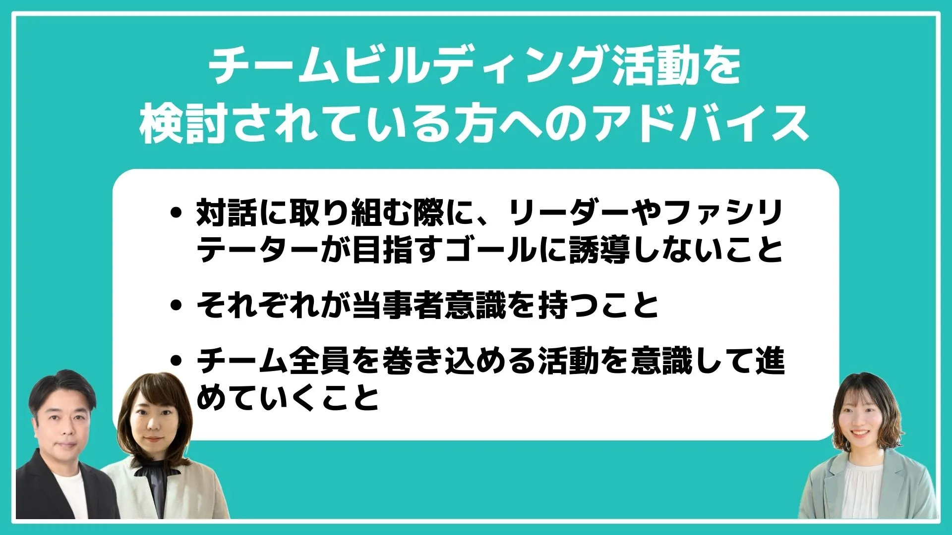 礒端:対話に取り組む際に、リーダーやファシリテーターが下手に目指すゴールに誘導しないことが大事かなと思います。そうなると、みんながリーダーやファシリテーターの考えに傾いてしまいます。全員の対話の中でアイデアを出し合って、チームとして同じ方向を向いて活動を進めていけるといいと思います。