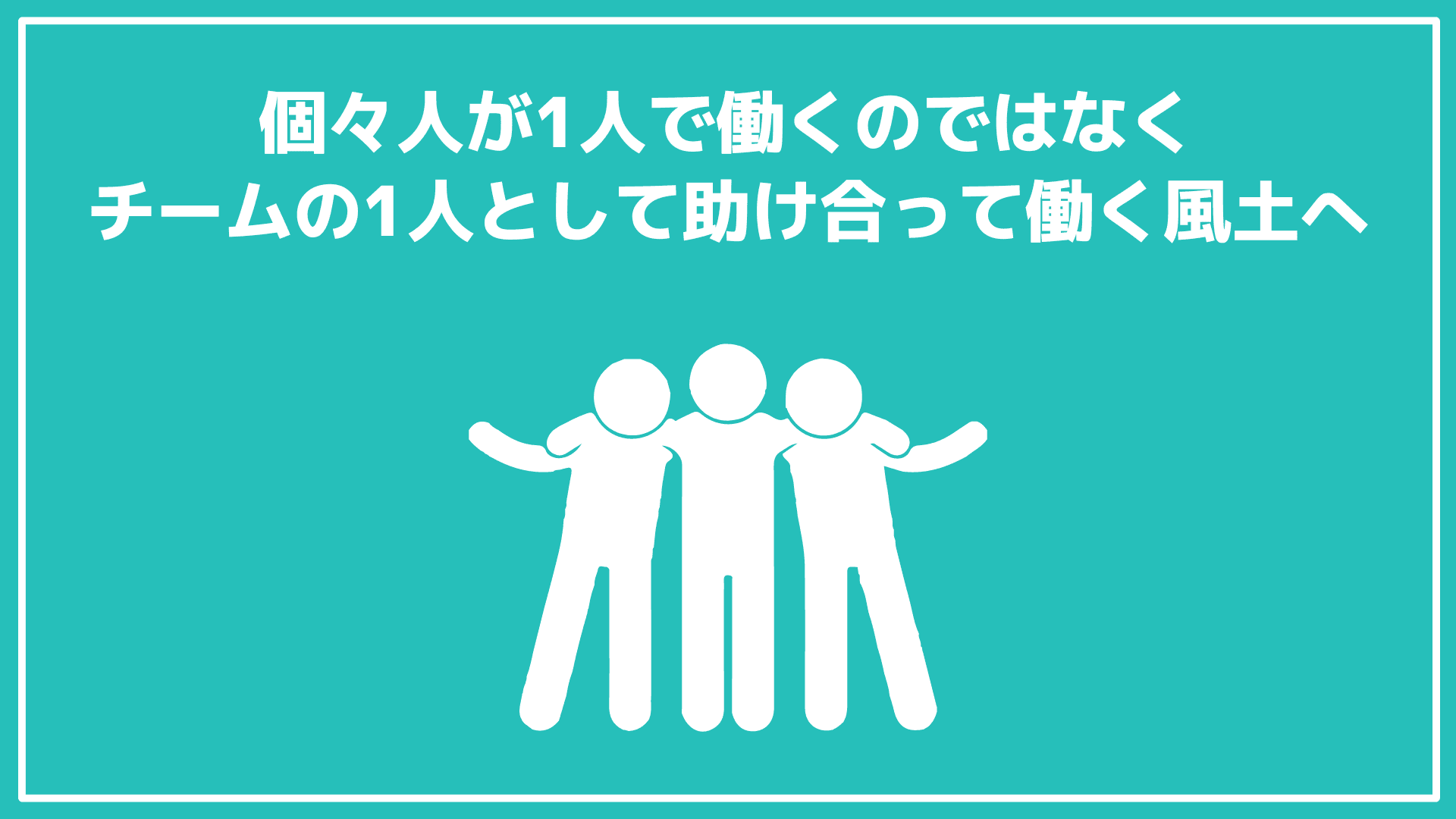 そのギャップをうめ、また、個々人が1人で働くのではなくチームの1人として助け合って働く風土をつくっていくべく活動を始めました。