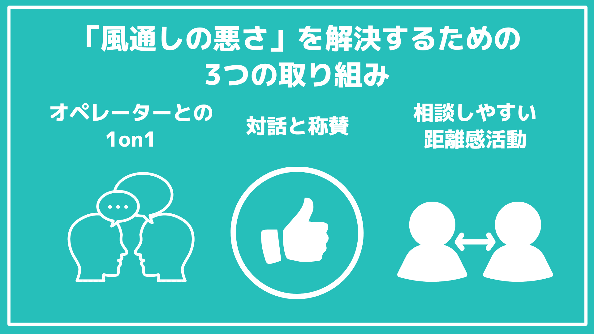そこで、私が主に取り組んだのが、オペレーターとの1on1と、オペレーターからの改善提案を通じた対話と称賛、そして「相談しやすい距離感活動」の3つです。