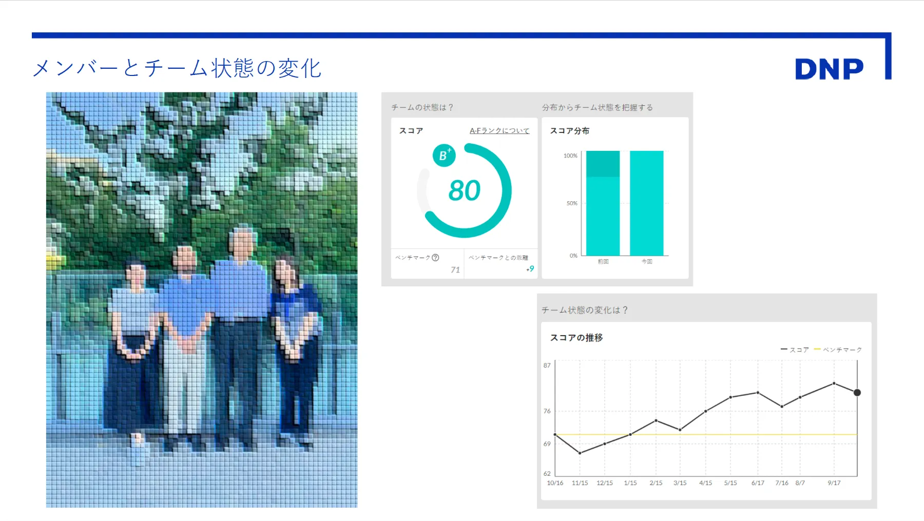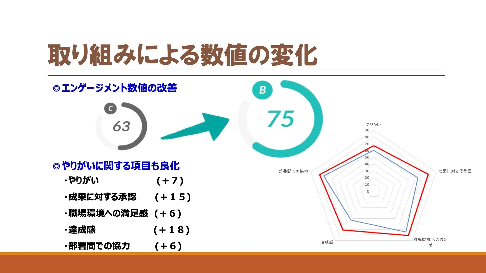 実際この取り組みにより、当初63ポイントだったスコアが現在では75ポイントにまで上がっています。特に成果に対する承認や達成感の項目が大きく上がっているので、ここにも活動の成果が反映されていると捉えています。