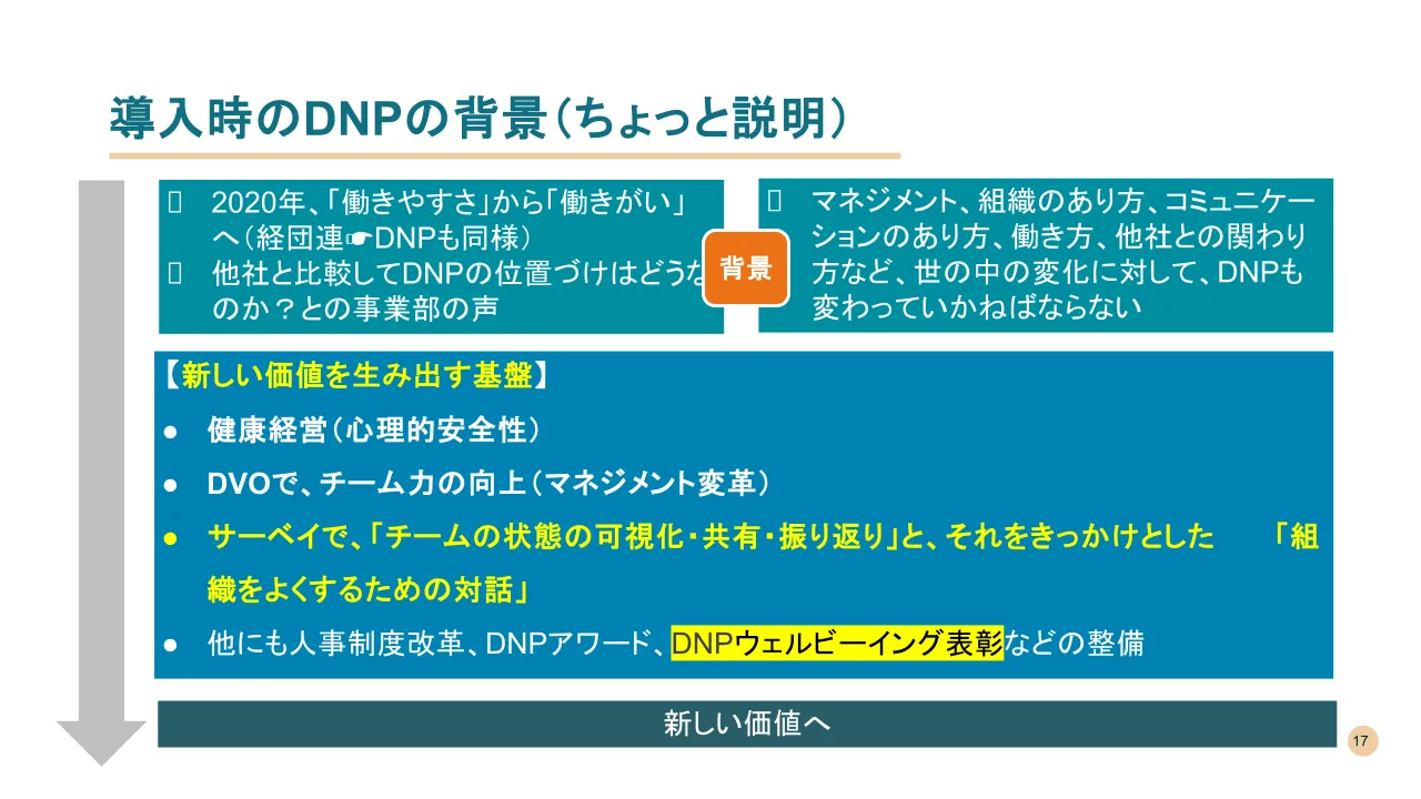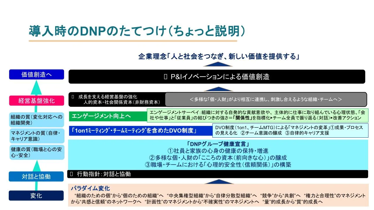 導入時の建付けについてですが、まず、2020年頃に会社でパラダイム変化に関するセミナーが行われ、その後2021年4月に、DNP独自の健康経営の目指す姿としてDNPグループ健康宣言が制定されました。同時にDVO制度が開始し、6月以降からはエンゲージメント向上を目的とした取り組みが始まりました。