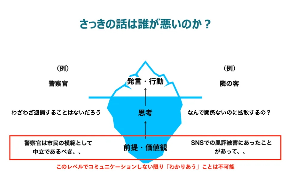 氷山モデルの話で言うと、まずは警察官または隣の客が悪いという発言があって、そこを対話で掘り下げていくと「わざわざ逮捕することはないだろう」「なんで関係ないのに拡散するの?」という思考があります。でもそれぞれ根本には「警察官は市民の模範として中立であるべき」とか「実はSNSで自分が風評被害に遭ったことがある」という価値観や前提があるんですね。