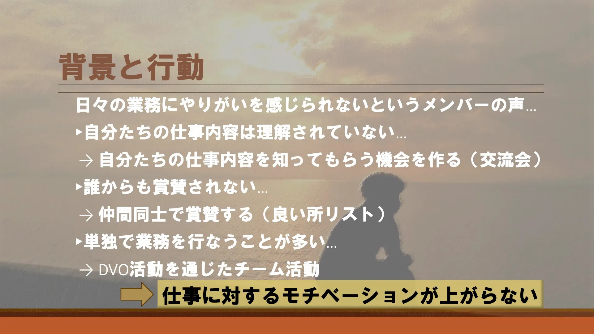 私たちが活動をスタートした時は、今回のように皆様に活動をご紹介する姿なんて1ミリたりとも想像できない状況でした。というのも、職務内容上、定量的な目標設定が難しく、職場環境の改革や改善について何をやっていいのかも分からなかったため、メンバーの活動へのモチベーションが上がることもありませんでした。そこで、どう取り組んでいくかを話し合っているうちに、「まずは目標を定めること」をDVO活動の目標にしてみたらどうかとアドバイスを得たので、そこからスタートすることにしました。