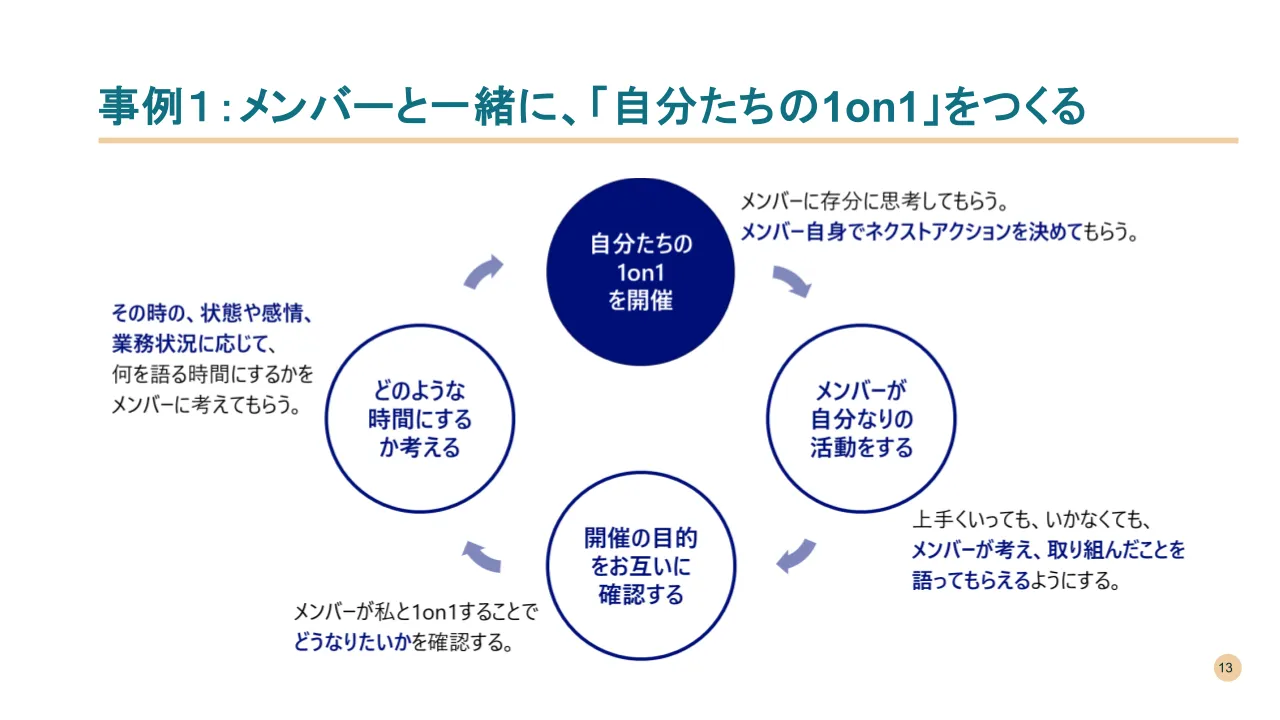 1つ目はメンバーと一緒につくる「自分たちの1on1」です。組織開発は正解がない問題というのは色んなところで耳にする話ですが、リーダー自身も答えを知らないことを理解した上で対話をしていくことが大切だと考えました。そこで生まれたのが「私とあなたの1on1にはまだ正解がないから、一緒に正解を探そう」といった目的の取り組みです。自分たちで1on1をデザインして実施し、どんどんブラッシュアップしていくというのは現場だからこそできることだと思います。